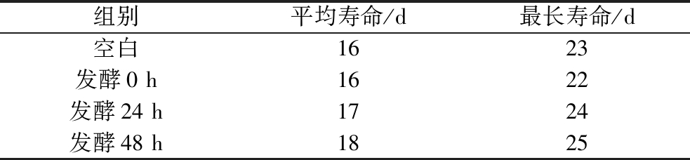 组别平均寿命/d最长寿命/d空白1623发酵0 h1622发酵24 h1724发酵48 h1825