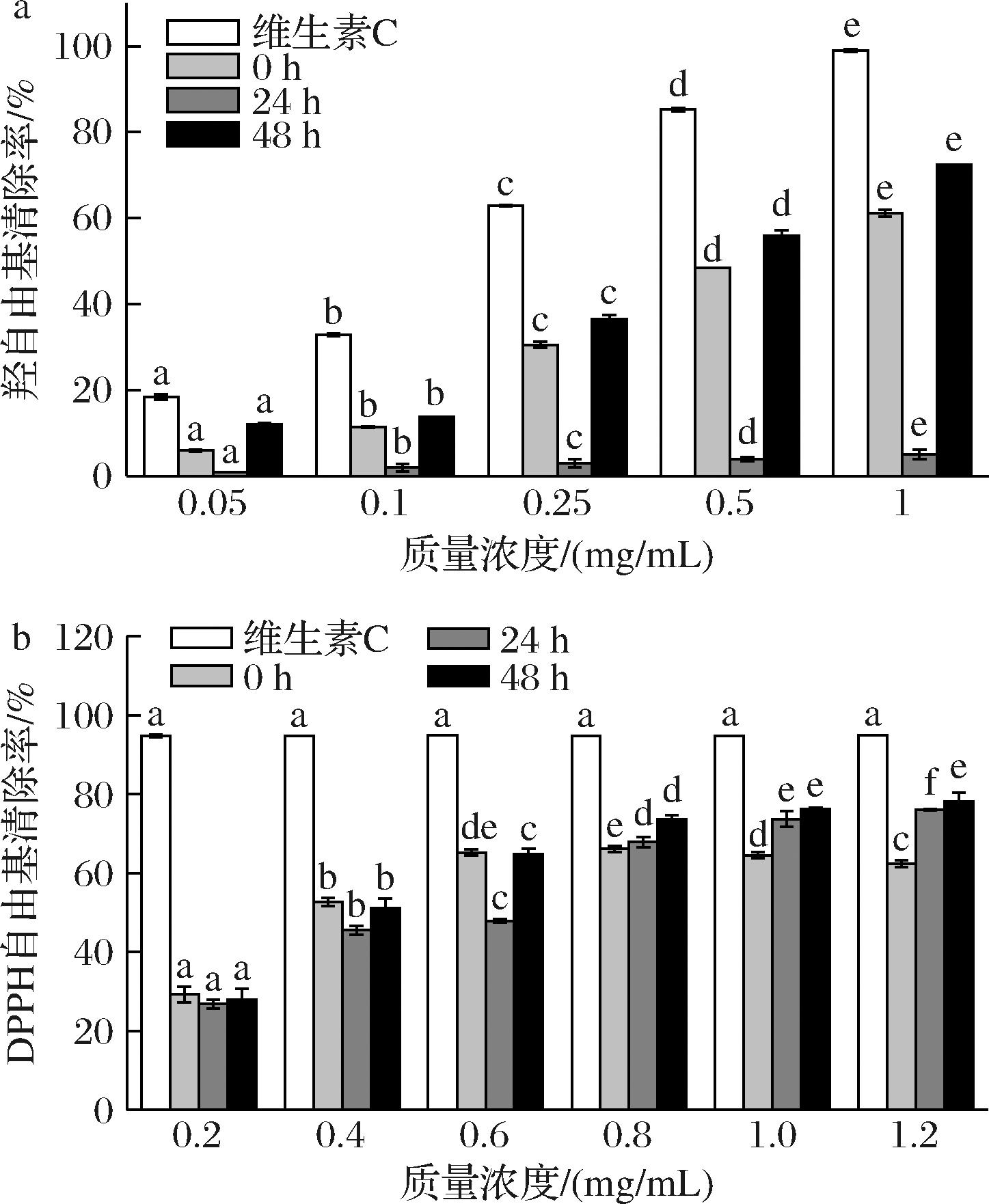 米糠发酵会产生许多生物活性成分,如植物甾醇、黄酮、多酚等,具有较高的抗氧化活性。羟自由基是一种活泼的氧自由基,可穿过细胞膜引起细胞发生氧化损伤。如图1-a所示,米糠发酵液对羟自由基清除能力随提取物浓度的增加而提高。当发酵液质量浓度为1.0 mg/mL时,24 h发酵组羟自由基清除率达72.5%,比未发酵组高了10%以上。如图1-b所示,DPPH自由基清除率随浓度的增加而上升。低浓度时不同发酵时间组的DPPH清除率差异不显著,在使用0.6 mg/mL以上质量浓度时,48 h的发酵组(清除率高达78.2%)明显高于未发酵组,可能是因为植物乳植杆菌发酵促进了米糠中游离酚的含量增加,而酚类化合物特殊化学结构可促使芳环上的羟基提供氢或电子,并赋予自由基清除活性和金属螯合电位的能力,具有强抗氧化、抗癌、抗炎等多种有益特性[20]。