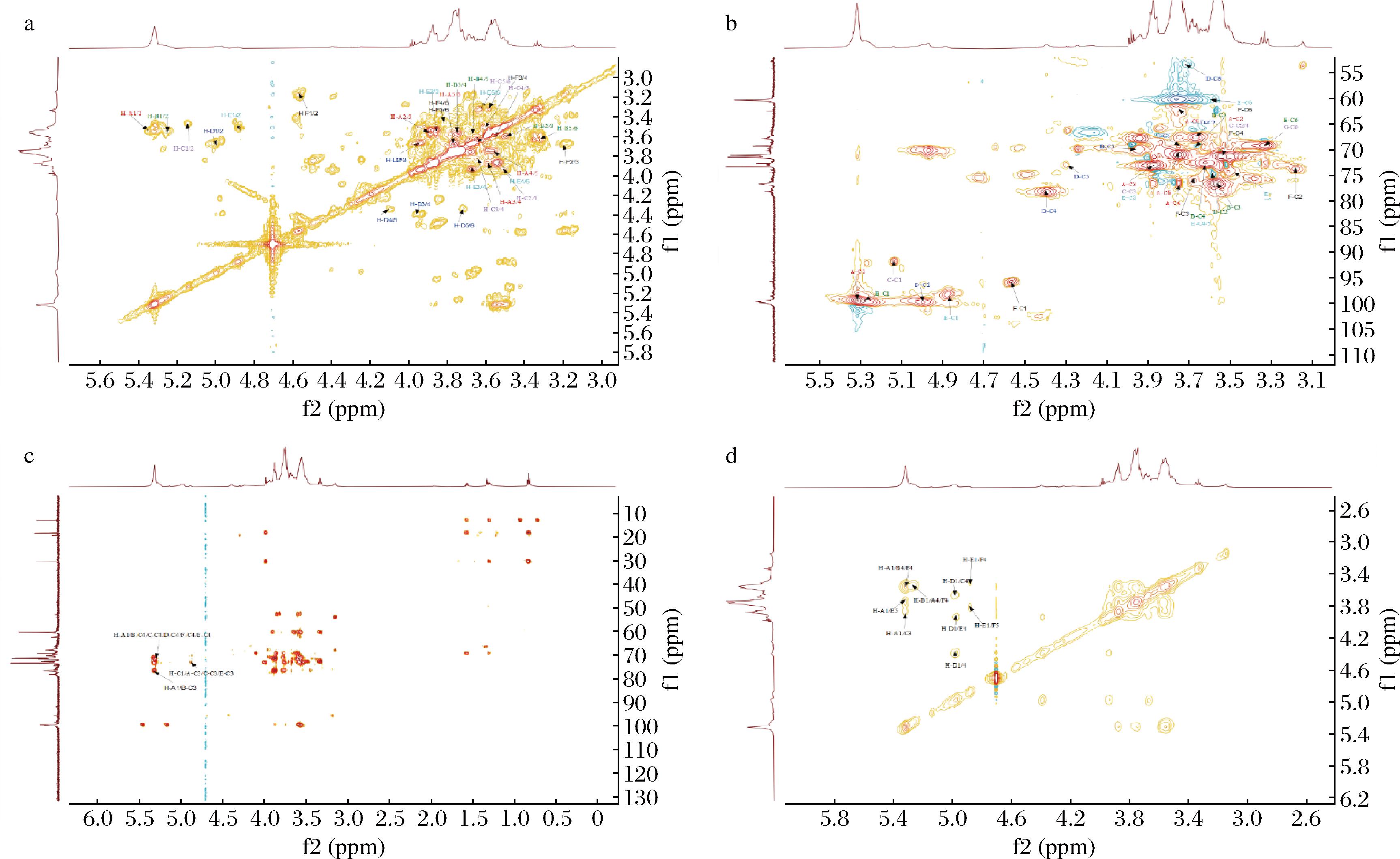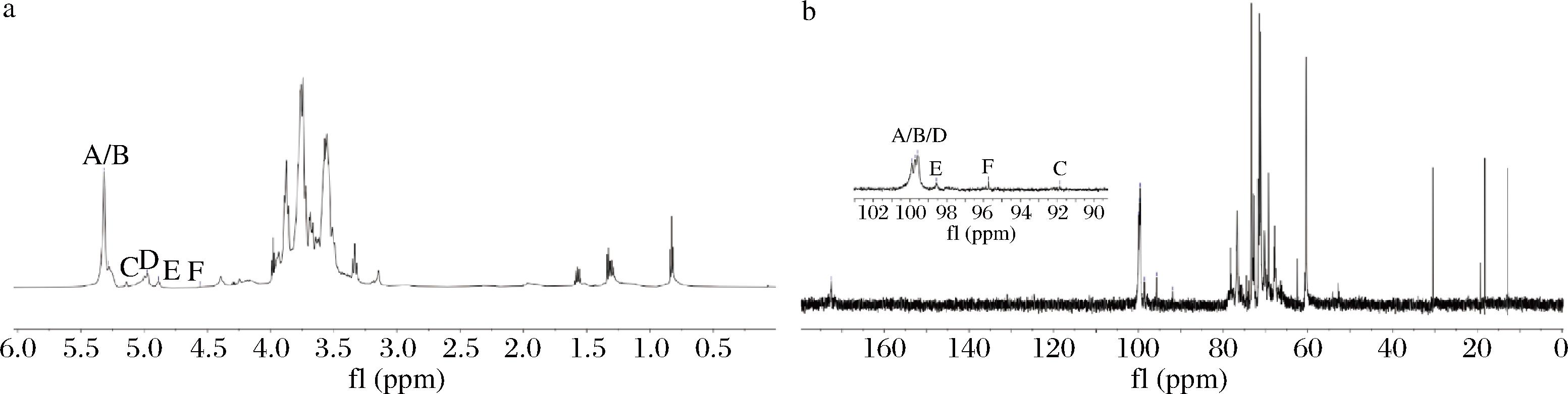 取适量的多糖样品溶解于99.9%的D2O中,使用Bruker DRX-600核磁共振波谱仪对样品的1H谱和13C谱进行测定。对样品进行氢-氢相关谱(correlation spectroscopy,COSY)、异核单量子相干谱(heteronuclear single quantum coherence,HSQC)、异核多键相关谱(heteronuclear multiple bond correlation,HMBC)、核奥弗豪泽效应谱(nuclear overhauser effect spectroscopy,NOESY)的采集。通过MestRanova对核磁数据进行处理和分析[20]。