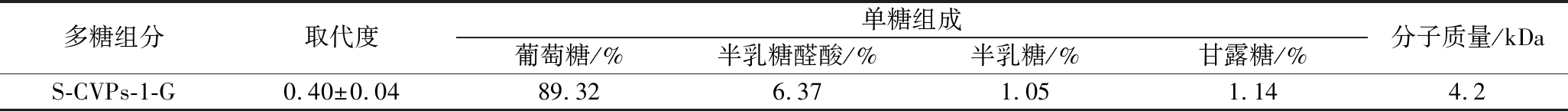 多糖组分取代度单糖组成葡萄糖/%半乳糖醛酸/%半乳糖/%甘露糖/%分子质量/kDaS-CVPs-1-G0.40±0.0489.326.371.051.144.2