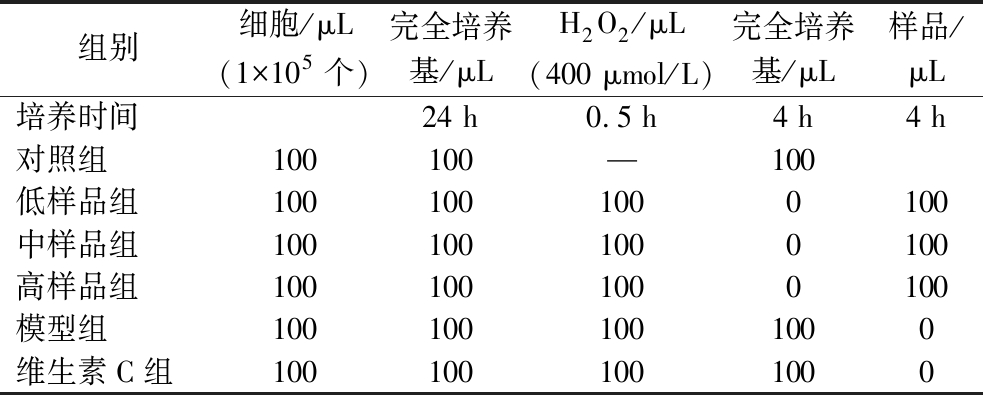 组别细胞/μL(1×105个)完全培养基/μLH2O2/μL(400 μmol/L)完全培养基/μL样品/μL培养时间24 h0.5 h4 h4 h对照组100100—100低样品组1001001000100中样品组1001001000100高样品组1001001000100模型组1001001001000维生素C组1001001001000