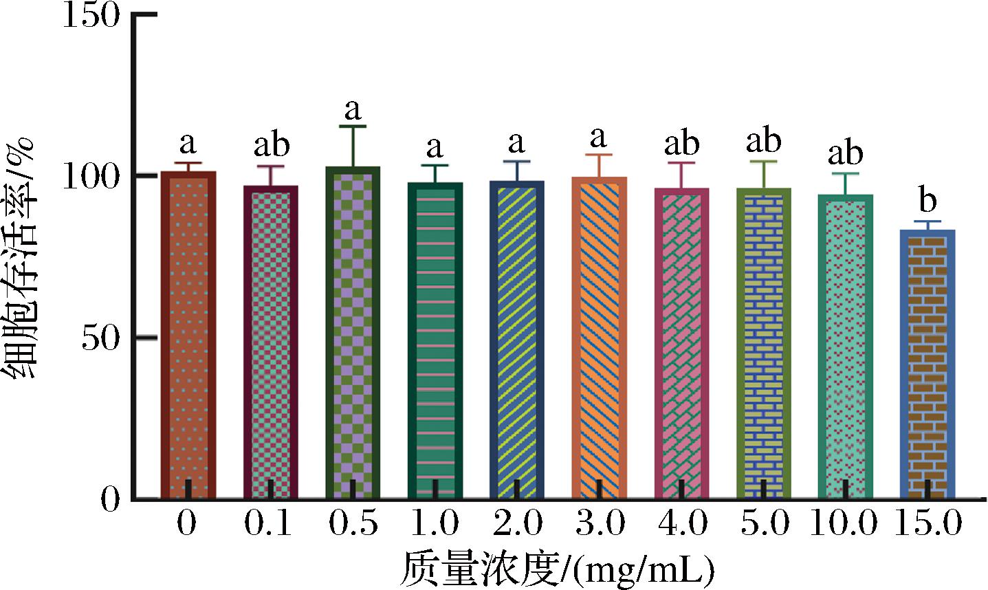 在一定质量浓度范围内,S-CVPs-1-G对HepG2细胞的活性不会产生影响,当超过该范围,会对细胞产生毒性作用[21]。细胞活性能够直观地表达细胞的损伤情况,选择CCK-8试剂盒检测不同质量浓度S-CVPs-1-G对HepG2细胞存活率的影响,确定安全给药浓度范围。如图1所示,S-CVPs-1-G在0.1~10.0 mg/mL时,HepG2细胞的存活率均大于95%,与对照组细胞无显著性差异(P>0.05)。当给药质量浓度达到15 mg/mL时,细胞存活率下降到了83.45%,表明细胞受到了损伤,同时,在0.5、1、2 mg/mL时有较高的细胞存活率,分别为102.69%、97.90%、98.43%,因此,选取0.5、1、2 mg/mL为低、中、高浓度组进行后续实验。