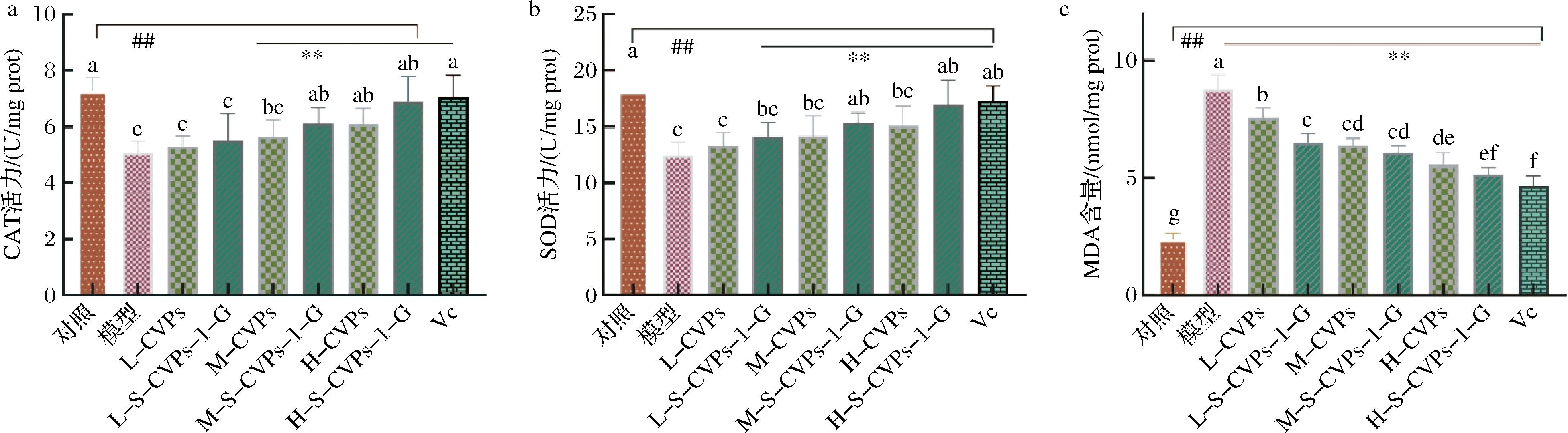 Fig.4 Effects of S-CVPs-1-G on intracellular CAT activity, SOD activity, and MDA content