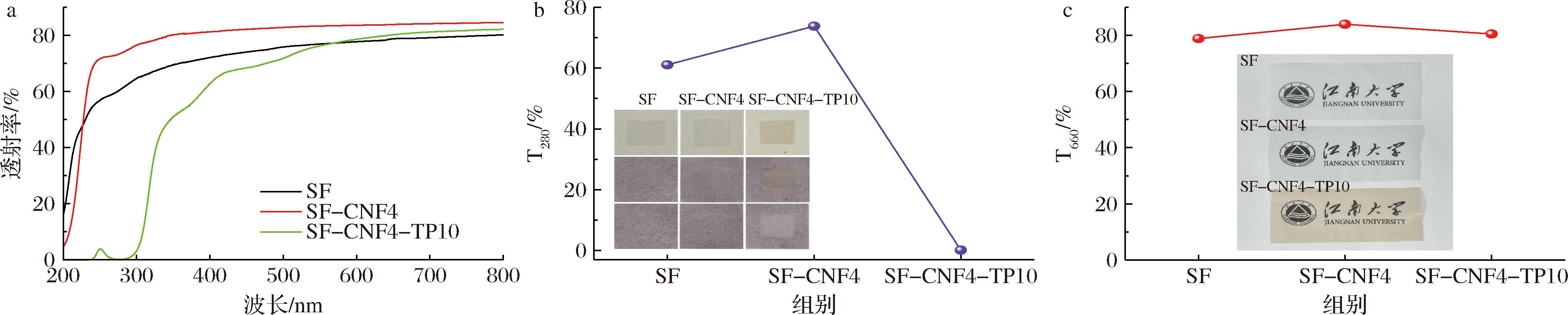 透明度和紫外线防护是食品包装薄膜保护食品质量的重要特性。在280 nm和660 nm处测定薄膜的透光率,以评估薄膜的紫外线阻隔能力和透明度[38]。SF-CNF4-TP10薄膜显示出优异的透射率水平,在280 nm处的紫外区域和660 nm处的可见光区域透射率分别为80.51%和0.16%。CNF-C的均匀分散和纳米级尺寸,使纤维能够相互缠绕形成均匀致密的薄膜,减少光线的散射和反射现象,使薄膜具有较高的透明度[39]。如图5-c所示,添加了CNF-C的SF-CNF4和SF-CNF4-TP10,透明度T660均高于SF(78.88%)。虽然添加TP导致T600的轻微下降,但仍高于80%,透明度令人满意可用于透明食品包装。此外,TP中所含的芳香环和酚羟基等不饱和基团赋予其优异的紫外屏蔽能力[40]。如图5-a所示,添加TP后,在200~400 nm的紫外区,SF-CNF4-TP10的透射率较低。在280 nm波长处的透过率下降至0.16%,这表明SF-CNF4-TP10具备优异的紫外线阻隔性能(图5-b)。紫外线灯照射实验可以直观地反映紫外线屏蔽能力。用不同的薄膜覆盖紫外线指示卡,然后用365 nm的紫外线照射1 min。去除薄膜后,覆盖区域的颜色变化越小,紫外线屏蔽能力越强。如图5-b(插图)所示,被SF-CNF4覆盖的区域出现了明显的颜色变化,而SF-CNF4-TP10几乎没有颜色变化。这一现象进一步证实了TP可赋予薄膜出色的紫外线阻隔能力。总之,CS/CNF/TP复合膜具备一定的透明度和紫外线阻隔性能,能够一定程度上保护包装食品免受紫外线辐射引发的光氧化和光降解反应。