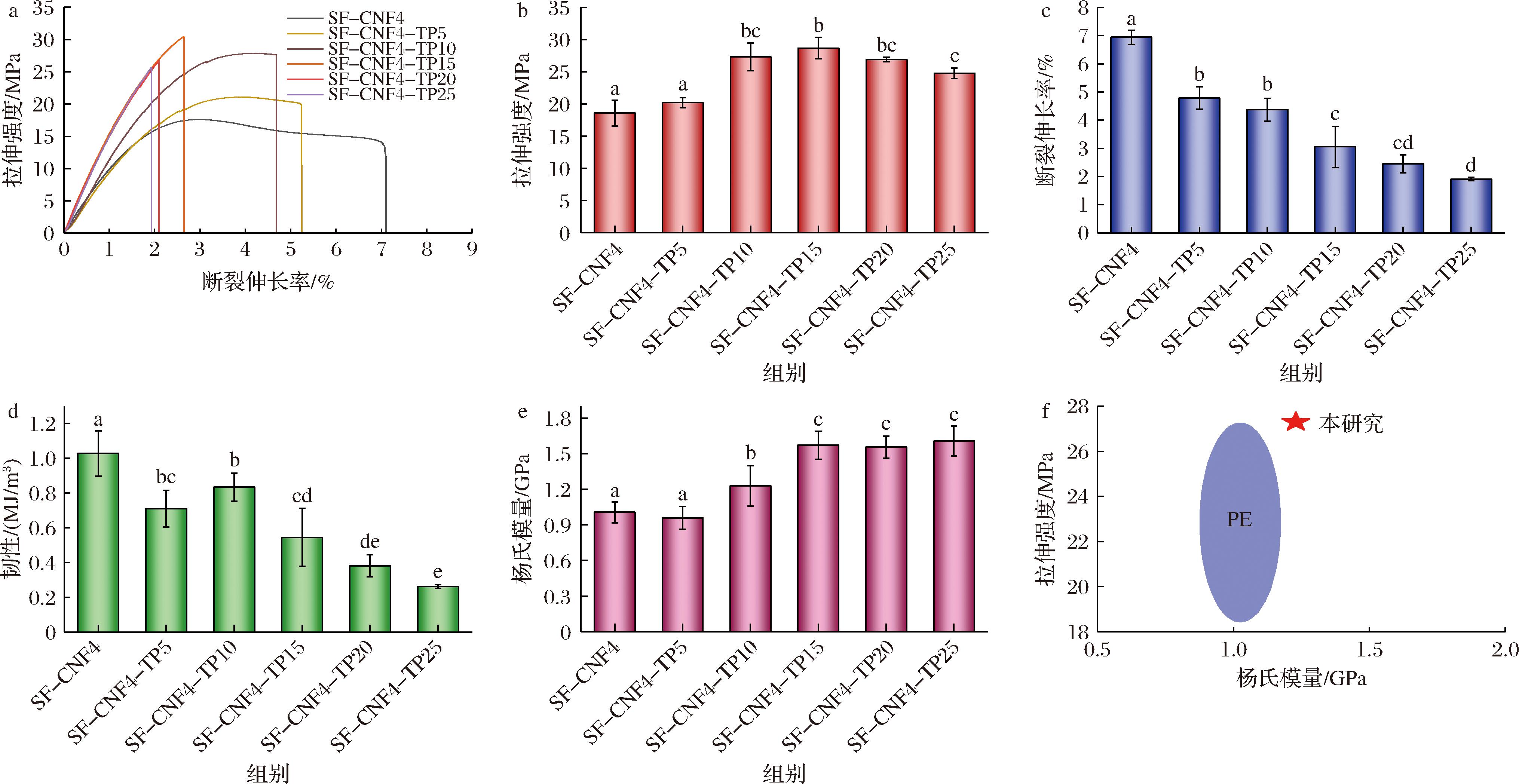 a-应力-应变曲线;b-拉伸强度;c-断裂伸长率;d-韧性;e-杨氏模量;f-SF-CNF4-TP10与PE膜机械性能的比较