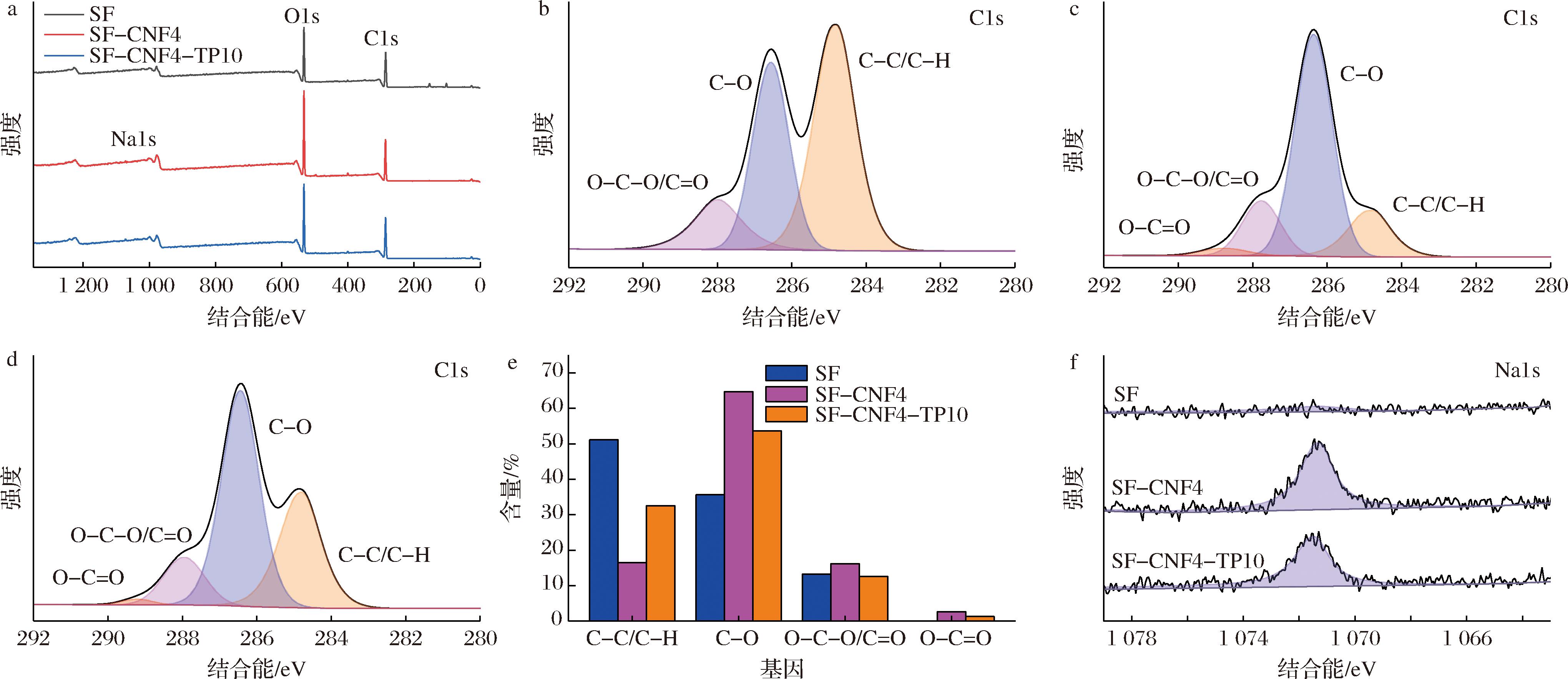 a-XPS 全谱;b-SF的C1s精细谱;c-SF-CNF4的C1s精细谱;d-SF-CNF4-TP10的C1s精细谱;e-相应的基团含量;f-Na1s精细谱