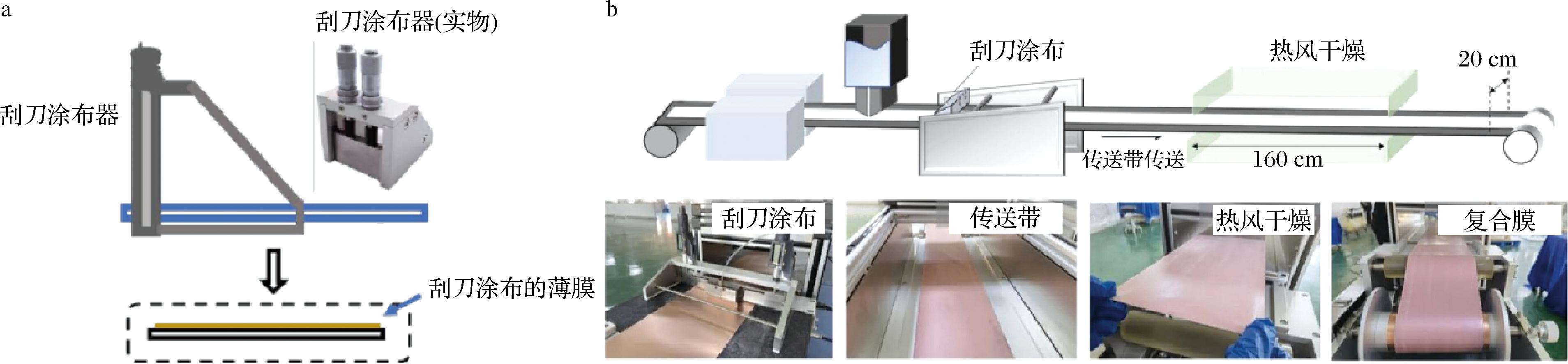 a-刮刀涂布器制膜示意图[16];b-刮刀涂布连续化加工工艺[12]