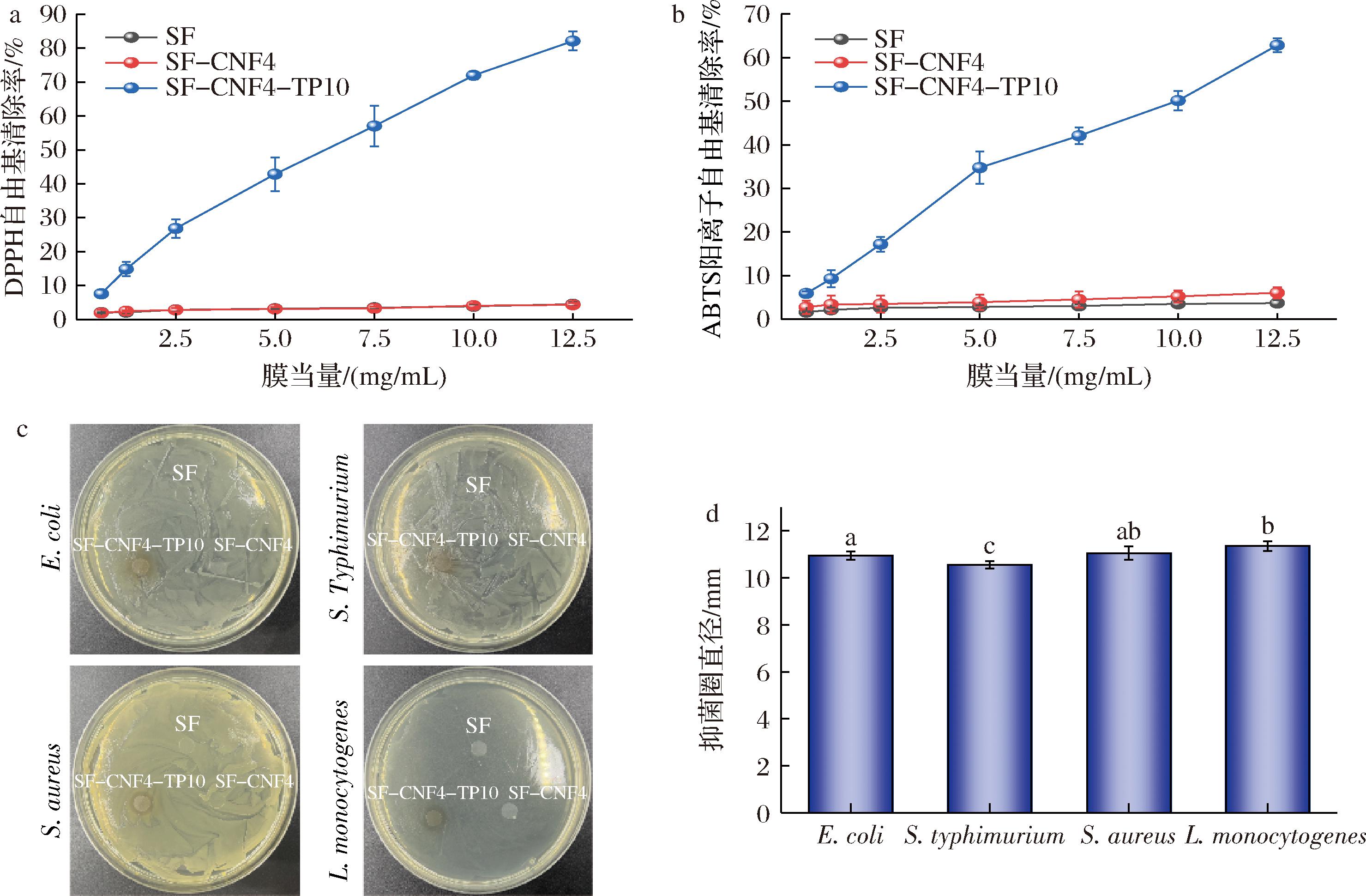 a-DPPH自由基清除率;b-ABTS阳离子自由基清除率;c-抑菌活性;d-SF-CNF4-TP10的抑菌圈直径