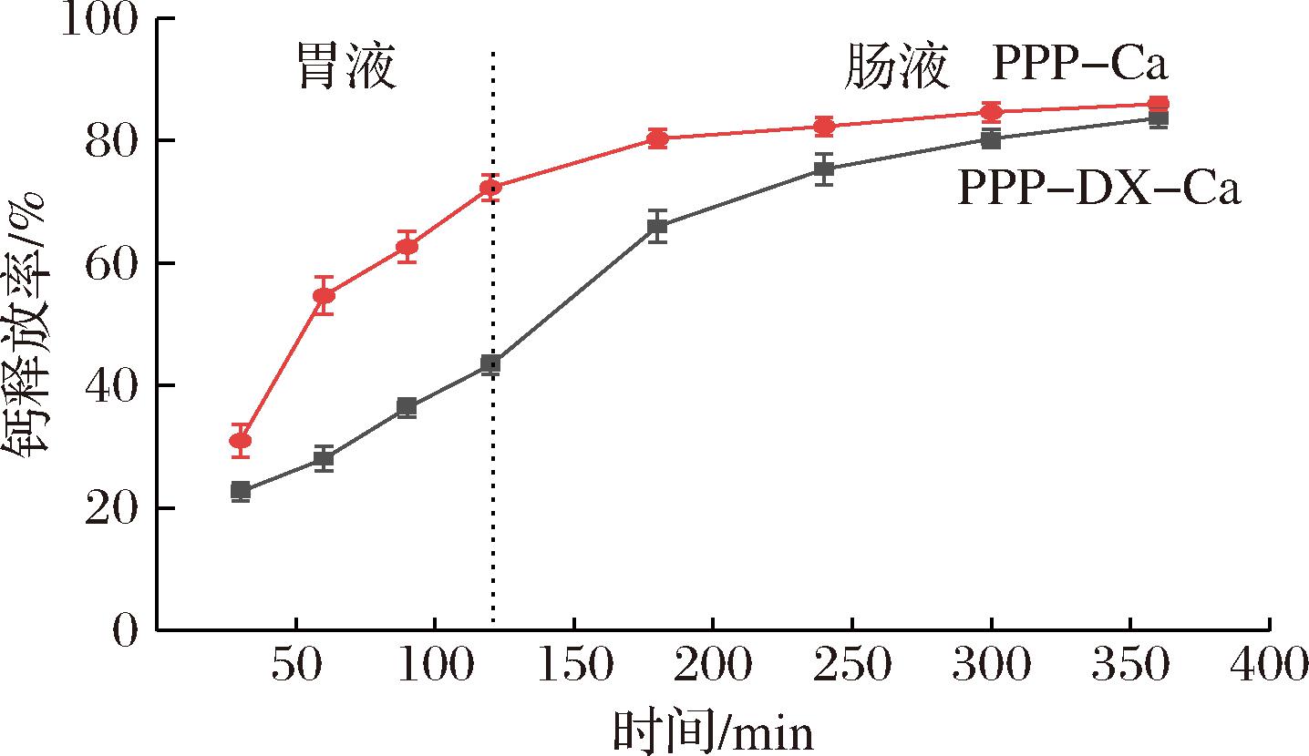 研究了PPP-Ca和PPP-DX-Ca在体外胃肠阶段的消化稳定性。如图6所示,PPP-DX-Ca和PPP-Ca在前2 h的胃消化阶段钙释放率分别为(43.33±1.52)%和(72.33±2.08)%。此外,接下来4 h的肠道消化阶段的钙释放率分别为(83.66±1.52)%和(87.00±1.00)%,表明PPP-DX降低了Ca2+在胃液中的降解速率。这是由于美拉德反应致使PPP的结构发生改变,偶联的DX在PPP表面产生了一定的空间位阻效应,减少了胃蛋白酶的水解作用,从而保护肽-钙在胃部环境中的稳定性[32],已有相关研究证实多肽-多糖复合物可以有效保护多肽中的钙稳定性,降低其在胃液中的降解速率,例如COS修饰核桃肽MMGGED制备钙递送体系COS-MMGGED-Ca在模拟胃液消化后,钙释放率从MMGGED-Ca的60.27%降低到了52.35%[33]。这些结果表明,PPP-DX可以有效保护Ca2+在胃液中的稳定性并在肠道中快速释放,达到控释的作用。