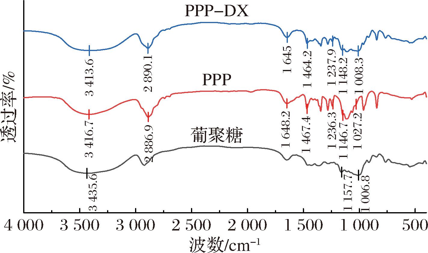 傅里叶红外光谱常用于鉴定化合物中官能团变化情况,是研究多肽与多糖相互作用的一种有效方法。如图2所示,在3 700~3 200 cm-1,PPP和DX吸收带较宽主要由羟基拉伸振动和N—H变形振动的引起,然而PPP-DX具有更宽的吸收峰,这可能是由于引入了DX的羟基基团加强了氢键,且与N—H的振动吸收峰重叠而峰型变宽[26]。PPP和PPP-DX分别在2 886.9 cm-1和2 890.1 cm-1处有吸收峰,均是由CH2不对称伸缩引起的[27]。1 700~1 600 cm-1的特征吸收峰是酰胺Ⅰ带,主要来源于C