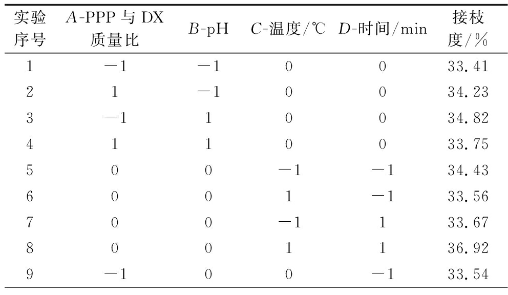 实验序号A-PPP与DX质量比B-pHC-温度/℃D-时间/min接枝度/%1-1-10033.4121-10034.233-110034.824110033.75500-1-134.436001-133.56700-1133.678001136.929-100-133.54