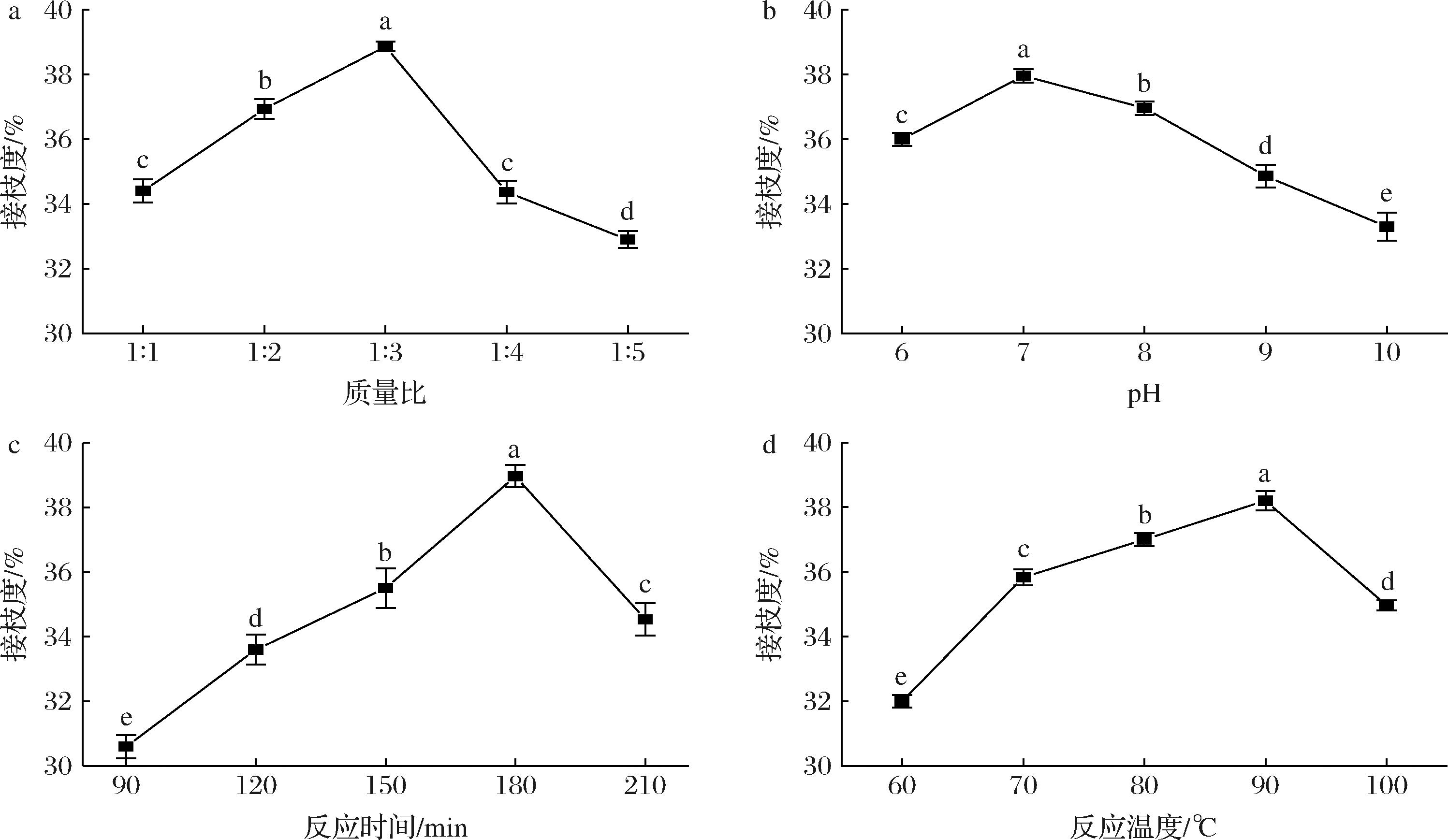 美拉德反应是蛋白质游离氨基和还原糖羰基之间的共价结合,接枝度表示反应前后的游离氨基含量的变化,接枝度越大,说明反应越完全。单因素试验结果如图1所示。
