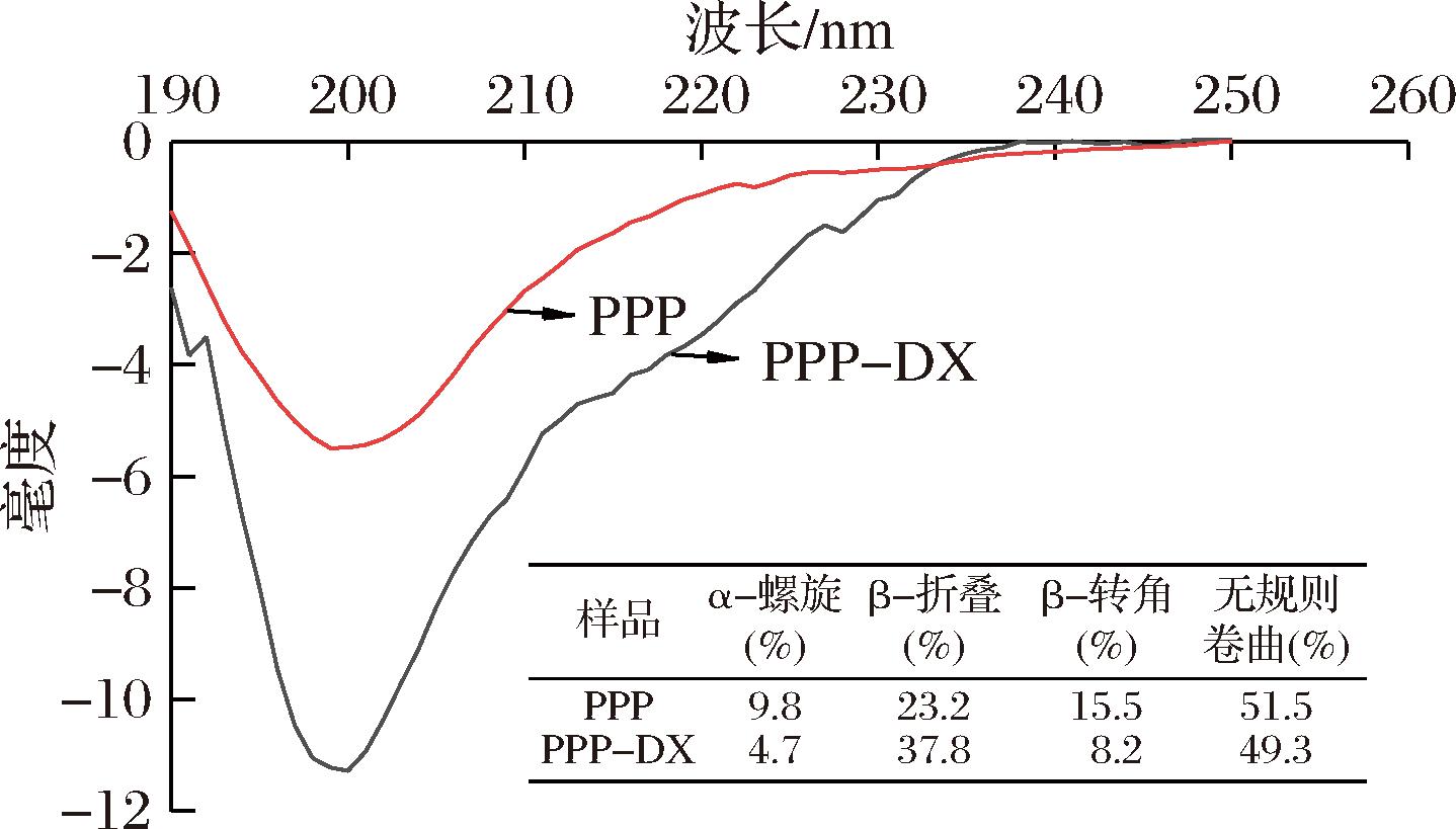 将PPP和PPP-DX样品用超纯水配制成0.1 mg/mL的溶液,在光程为0.1 cm的石英池中,对这些样品在190~260 nm的波长范围内进行了3次扫描,使用超纯水作为空白校正。二级结构组成采用杨氏算法(https://bestsel.elte.hu/index.php)进行计算[7]。