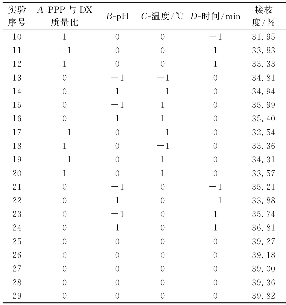 为0.929 1,两者差值<0.2,说明此模型与试验之间拟合程度较高,适合用于优化PPP-DX的制备工艺。由F值可判断出各因素对接枝度的影响顺序为(D)时间>(C)温度>(A)PPP与DX质量比>(B)pH。