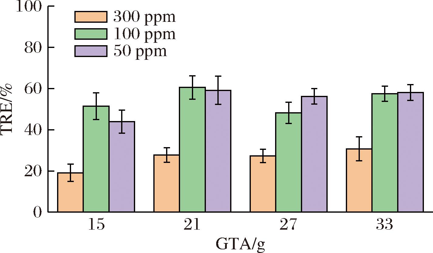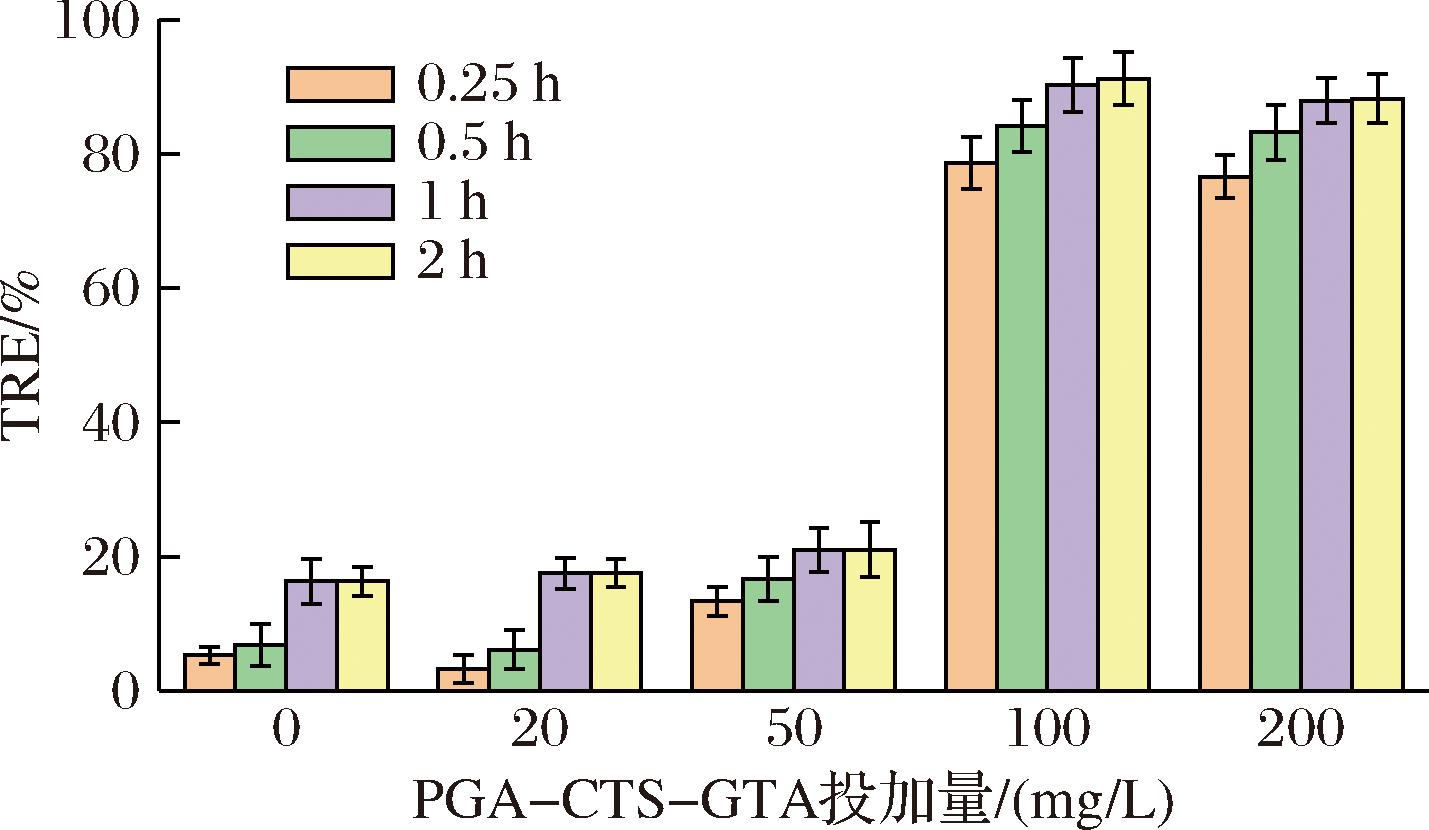 参考DONG等[13]和WANG等[14]对于微藻絮凝的实验方法,用稀释藻液进行絮凝实验。实验前先以300 r/min搅拌2 min得到均匀混合物。用去离子水新鲜配制质量浓度为0.5%的PGA-CTS-GTA原液,在50 ℃下磁力搅拌至完全溶解或分布均匀。实验中的所有搅拌过程均采用四联磁力搅拌器进行,评价絮凝剂在室温下的絮凝性能。絮凝程序为300 r/min快速混合1 min,沉降15 min。然后立即收集上清液,用分光光度计测量在680 nm下的吸光度。絮凝剂的絮凝效率即浊度去除效率(turbidity removal efficiency,TRE)按公式(1)计算: