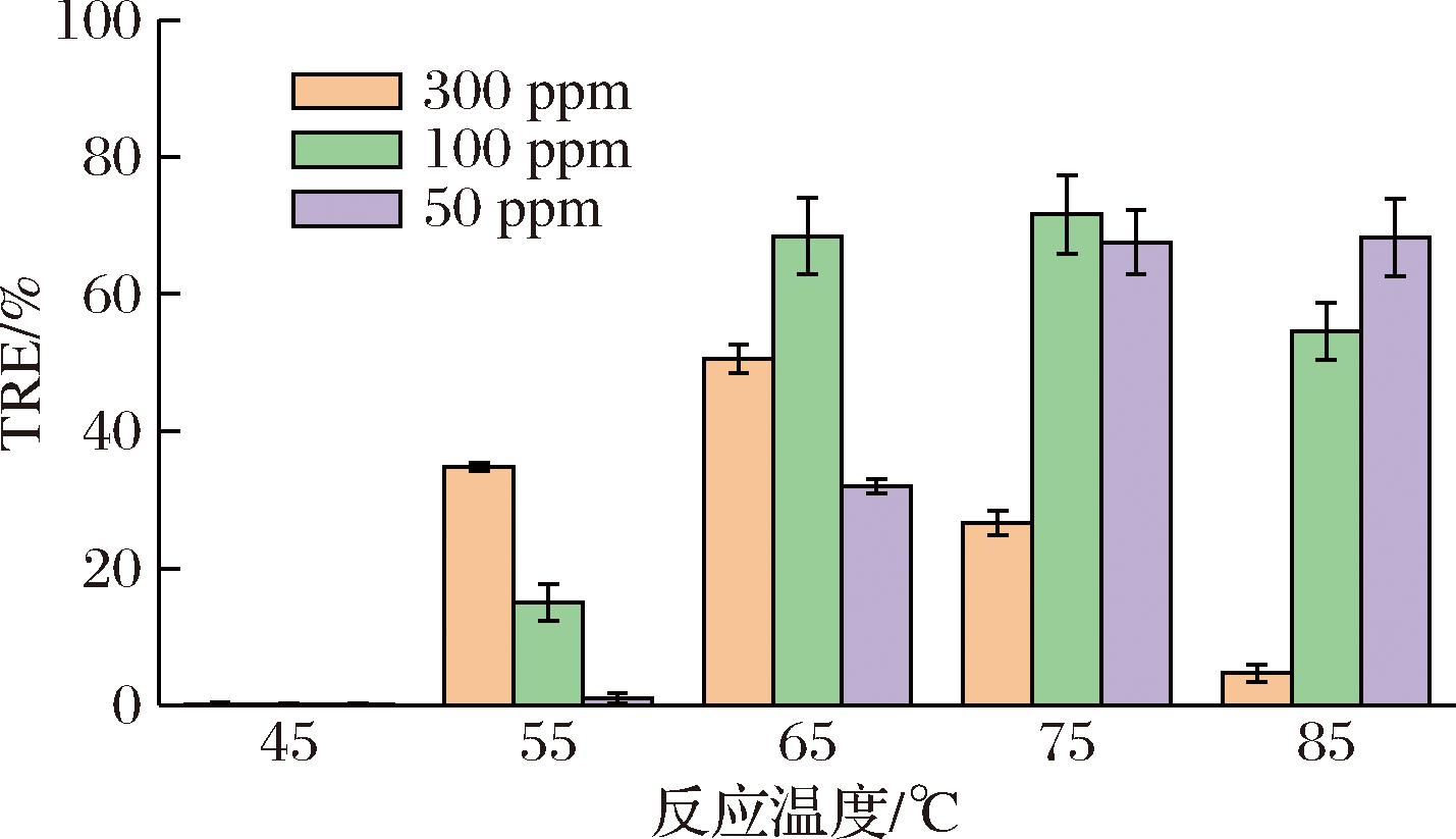 固定反应时间为4 h,调节反应温度为45、55、65、75、85 ℃,结果如图5所示。其中在65 ℃时制备得到的改性混合物在50、100 mg/L投加量下的絮凝效果分别32.01%和68.48%,而温度升高至75 ℃时,50、100 mg/L的改性混合物对应絮凝效果达到67.54%和71.63%,相比65 ℃的条件下50 mg/L提高了1倍,但100 mg/L投加量下仅提高了3.15%。进一步提高季铵盐与高分子混合物反应温度并不会提升改性混合物的絮凝效果,对于大于100 mg/L投加量时甚至有明显负面作用。尽管提高温度可以提高季铵盐接枝反应速率,但PGA在酸性条件下温度越高降解速度越快,造成PGA-CTS-GTA分子质量损失,降低了微藻絮凝效率[15]。