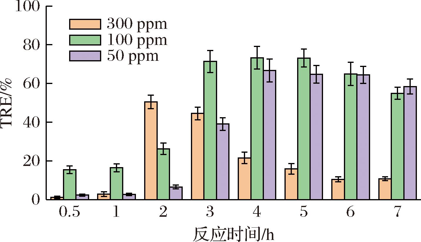 维持前述季铵盐与高分子混合物浓度比与反应pH,调整反应时间从0.5 h到7 h,如图4观察到随着反应时间的延长,絮凝效果先上升再下降。当反应时间低于3 h时,絮凝效果随反应时间增长而迅速上升,至3 h时投加量为50、100 mg/L的絮凝效果分别为71.36%和39.05%;在50、100 mg/L投加量下最佳絮凝效果出现在4 h,絮凝效果分别为73.26%和66.78%;在此之后随着反应时间增加絮凝效果缓慢下降。反应底物PGA-CTS中的活性基团量在反应初期发生反应的比例较低;反应时间增加后季铵盐改性比例的增加导致絮凝效果变好;超过最适点后一段时间内可供反应的活性基团个数趋于饱和, PGA- CTS-GTA的微藻絮凝效率趋于平稳;时间过长后PGA分子质量变低,造成PGA-CTS-GTA降低从而影响絮凝结果。再者是随着反应的不断进行,醚化剂接枝到PGA-CTS-GTA分子链上的量不断增多,使得PGA-CTS周围的空间位阻在不断增加,不利于反应继续进行。