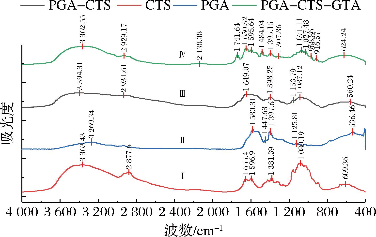图6 PGA、CTS、PGA-CTS、PGA-CTS-GTA红外光谱图