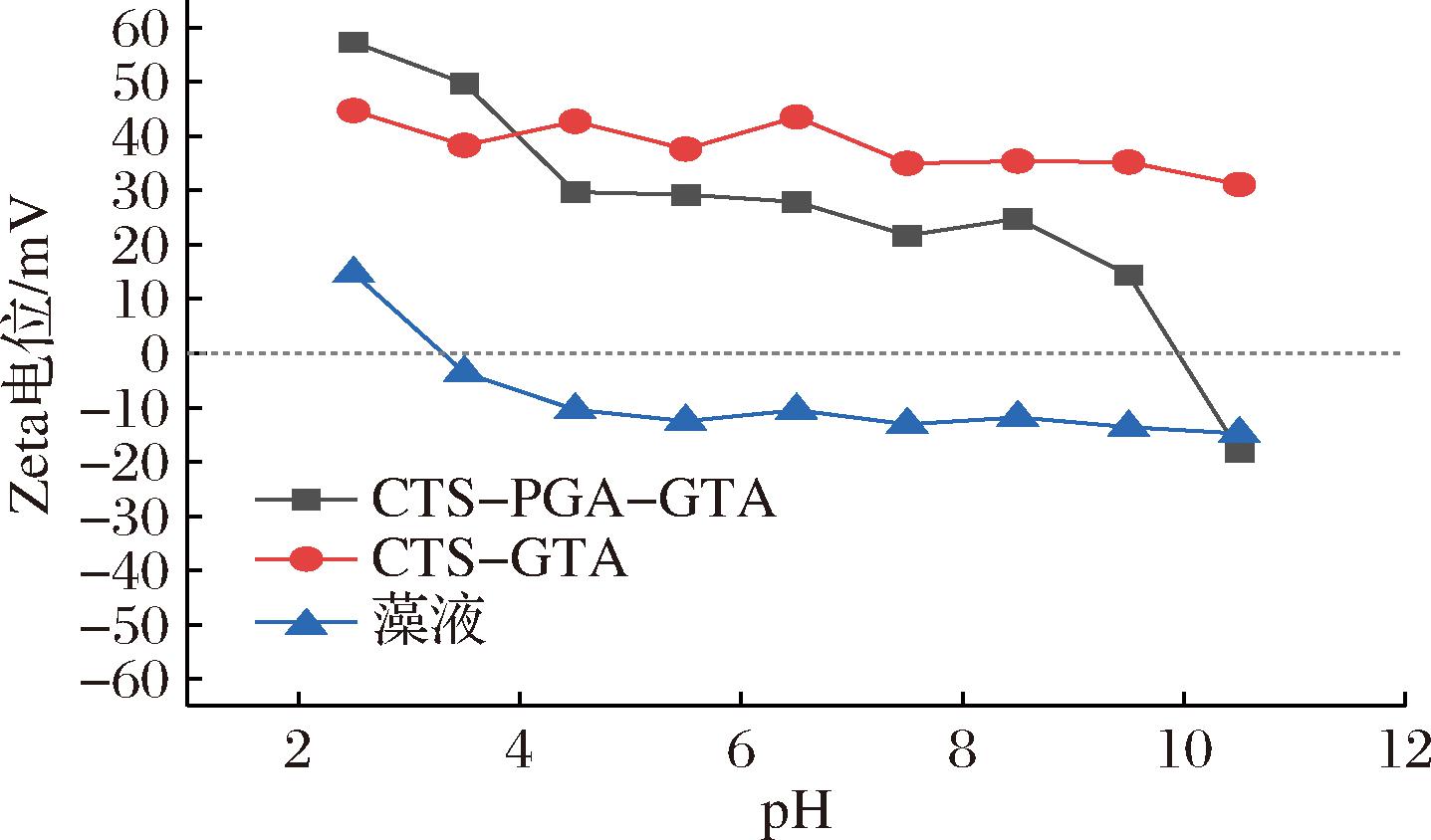 精确称量定量样品并配制成0.5 g/L的PGA-CTS-GTA溶液,利用稀NaOH溶液和稀HCl溶液将其调为pH 2.5~10.5的溶液,使用纳米粒度仪测量各个体系的Zeta电位。