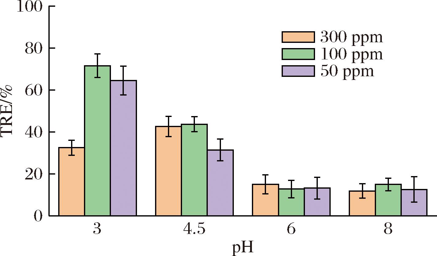如图2所示,反应pH值维持在3.0附近时,制备得到的聚谷氨酸/壳聚糖混合改性物的絮凝效果最佳,投加量为50 mg/L时絮凝效率达到64.44%,而投加量为100 mg/L时絮凝效率达到71.48%。随着反应pH值提高到4.5时,投加50、100 mg/L混合高分子改性物的絮凝效率分别为31.37%和43.67%,相比反应pH值为3.0时分别下降了33.07%和27.81%。当pH值提高到接近中性的6.0和偏碱性的8.0时,混合高分子改性物的絮凝效果显著降低,50~300 mg/L投加量对应的絮凝效率均低于20%。目前报道的与GTA反应的途径以碱性条件或非均相为主,本研究则是在酸性条件下进行反应。其反应机理可能为酸性条件下环氧基的质子化活化,质子化后的氧鎓环亲电性大大增强,极容易被氨基等亲核基团进攻开环发生加成反应。