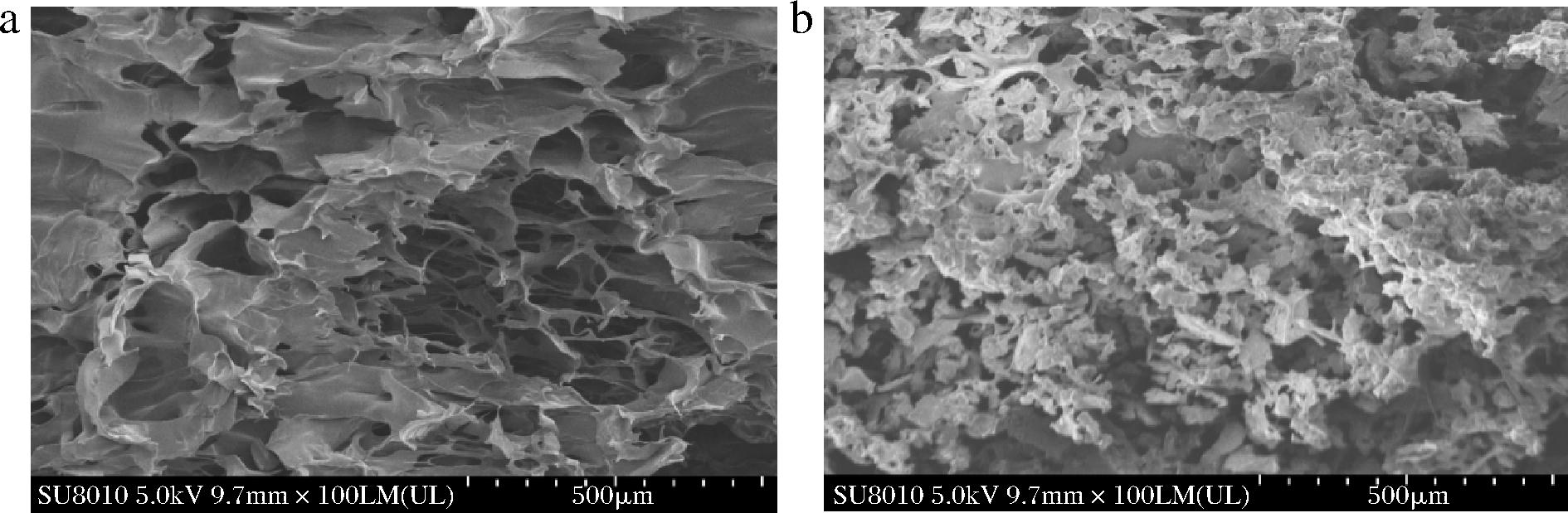 将干燥的PGA-CTS和PGA-CTS-GTA裁剪至合适大小,黏在导电胶上喷金,用场发射扫描电子显微镜观察二者表面形貌,拍照观察并记录。
