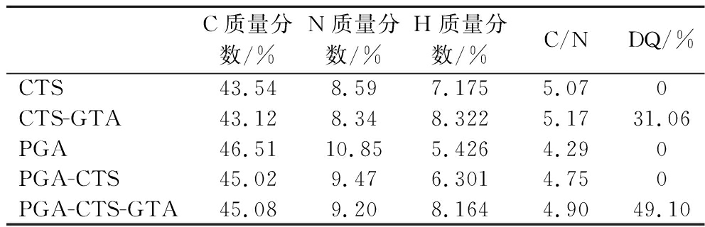 C质量分数/%N质量分数/%H质量分数/%C/NDQ/%CTS43.548.597.1755.070CTS-GTA43.128.348.3225.1731.06PGA46.5110.855.4264.290PGA-CTS45.029.476.3014.750PGA-CTS-GTA45.089.208.1644.9049.10