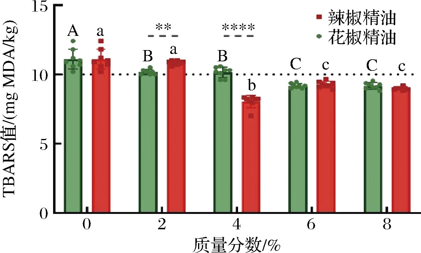 注:不同大写字母表示花椒精油不同质量分数相同油炸条件的平均值差异显著(P<0.05),不同小写字母表示辣椒精油不同质量分数相同油炸条件的平均值差异显著(P<0.05)。*表示相同质量分数相同油炸条件下辣椒精油与花椒精油的平均值差异性,**P<0.01, ****P<0.000 1,未标注表示差异不显著。