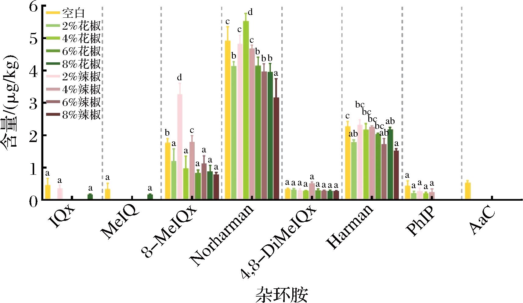 图2 花椒精油和辣椒精油对油炸猪里脊中杂环胺含量的影响