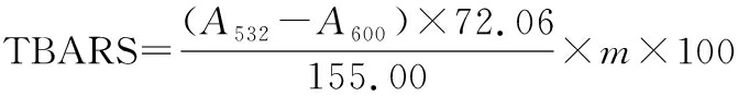 准确称取2 g样品,接入10 mL 0.4%(体积分数)TBA,均质机匀浆后再置于涡旋振荡器上涡旋5 min。混合均匀后沸水加热30 min,冷却至室温后,4 ℃,6 000 r/min离心10 min,取出上清液5 mL加入5 mL氯仿,静置分层后取澄清上清液在532 nm和600 nm波长处测定吸光值,按照公式(2)计算TBARS值: