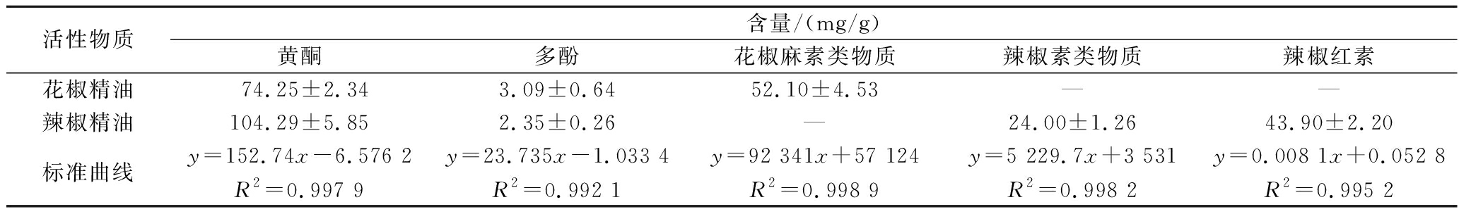 花椒和辣椒2种精油中酚类、黄酮类物质、花椒麻素类物质、辣椒素类物质、辣椒红素等活性物质含量如表2所示。花椒精油中的黄酮含量低于辣椒精油,而多酚含量高于辣椒精油。