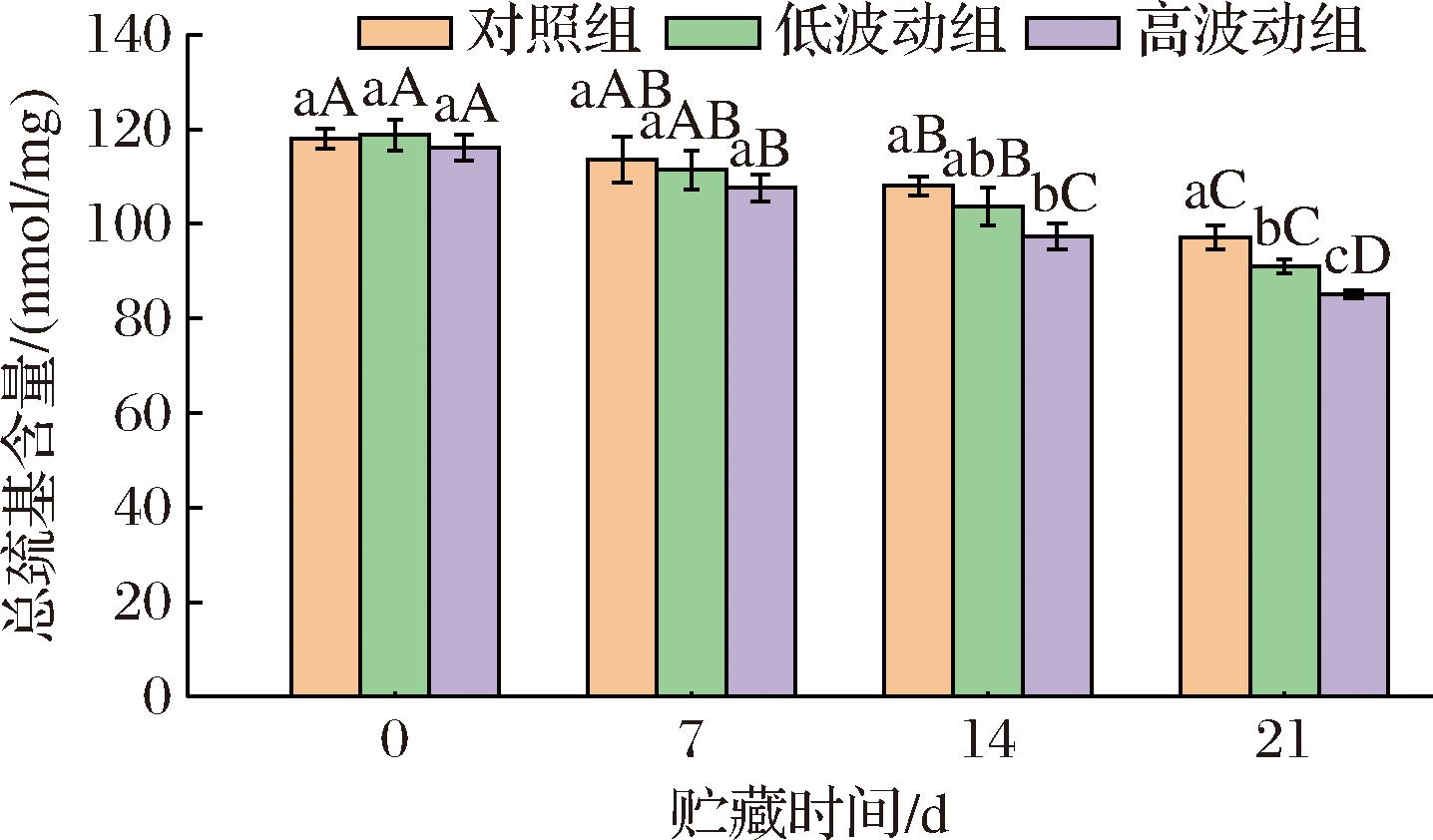 如图7所示,贮藏期间,各组的总巯基含量均显著下降(P<0.05),表明微冻贮藏过程中猪肉的蛋白氧化程度升高,这与卢骁等[22]的研究结果一致。微冻猪肉中部分水分形成冰晶后,会破坏肌球蛋白的构象,从而使分子内部的活性巯基暴露,进而氧化形成二硫键。贮藏0 d和7 d时,各组总巯基含量无显著差异(P<0.05),而延长至14 d时,与对照组相比,低波动组总巯基含量无显著变化,而高波动组显著降低(P<0.05)。贮藏21 d时,3组的总巯基含量差异显著,其中高波动组总巯基含量最低。较高的温度波动会造成猪肉反复冻融,冰晶的生长和重结晶可能造成细胞结构发生机械损伤,使蛋白质的空间结构发生变化,导致巯基暴露并更容易被氧化[30]。