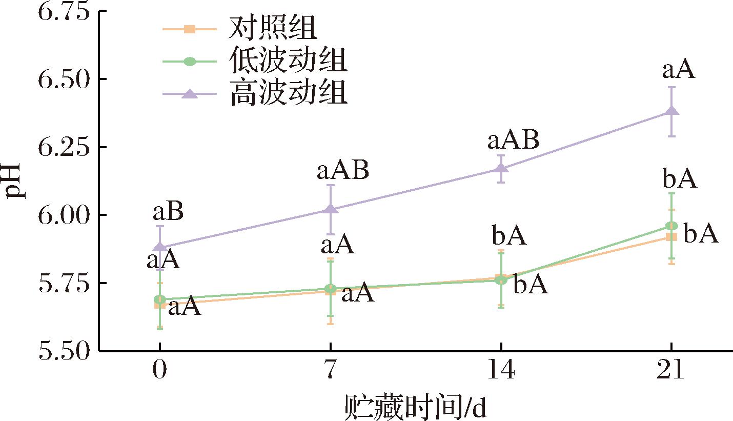 由图2可看出,在贮藏过程中,对照组和低波动组pH值略微上升,但无显著变化(P>0.05),而高波动组猪肉pH值显著上升(P<0.05),并在贮藏第14和21天时,高波动组显著高于另外两组(P<0.05)。以上结果表明,(-3±2) ℃波动处理不会造成肉的pH值发生变化,而温度波动水平进一步提高至(-3±4) ℃,会使猪肉样品反复冻融,在内源酶和微生物的作用下,猪肉内部的蛋白质和氨基酸被分解为氨等碱性物质[26-28],进而导致pH值的上升。