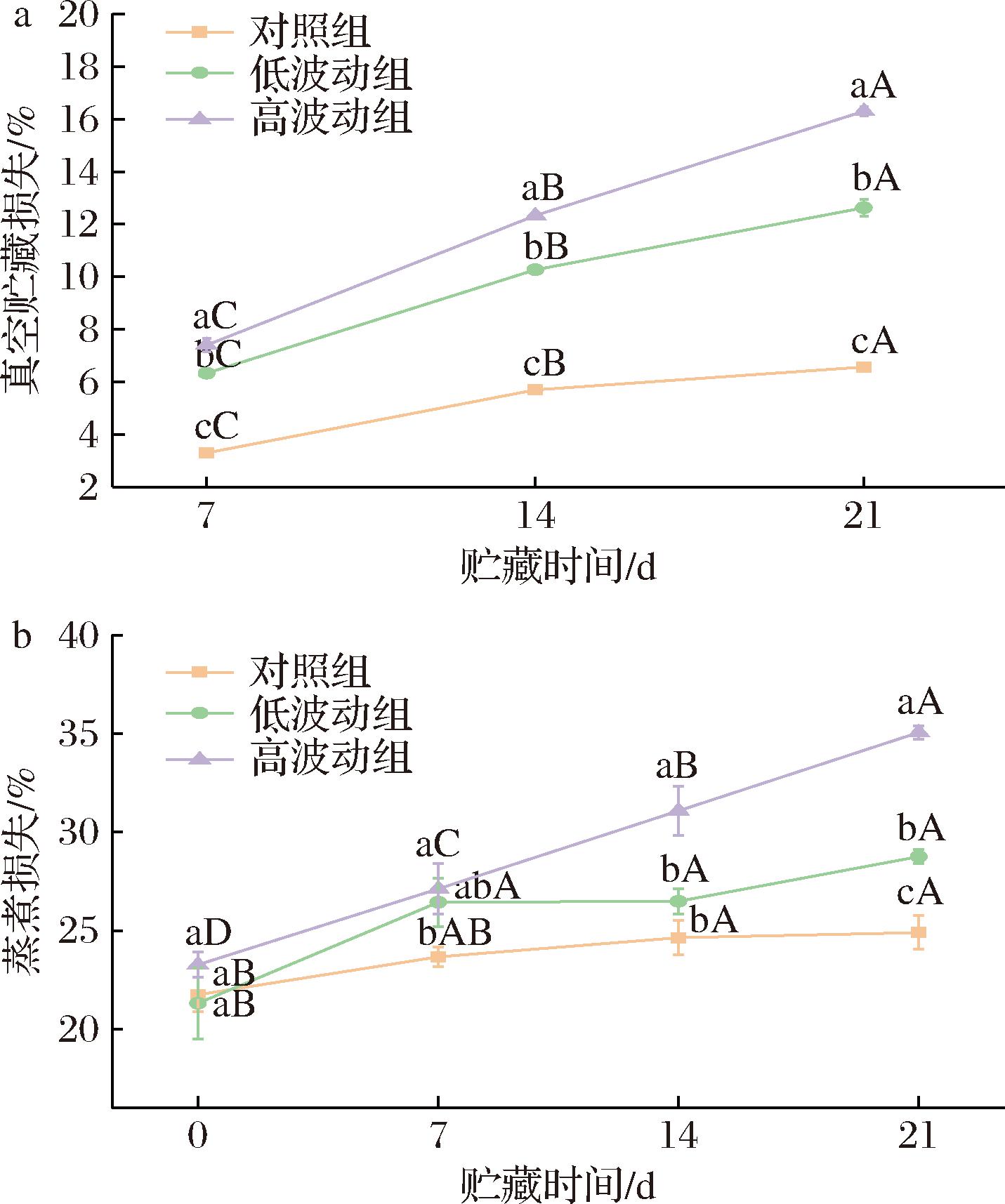 通过测定真空贮藏损失和蒸煮损失来评估微冻猪肉的保水性。从图3可知,各组真空贮藏损失及蒸煮损失均呈上升趋势(P<0.05)。贮藏初期,在钙激活酶等内源酶的作用下,肌原纤维蛋白发生降解,大大减弱了肌原纤维蛋白束缚水分的能力,使得水分从肌纤维内部向外部迁移,造成水分流失。此外,贮藏时间增加,会造成猪肉中的不易流动水逐渐向自由水迁移,使得水分更容易从肉中流失,导致保水性下降[29]。贮藏7、14、21 d时,温度波动组的真空贮藏损失均显著高于对照组,其中高波动组真空贮藏损失最高(P<0.05)。KAALE等[30]的研究报道了类似的结果,温度波动会引起肉中冰晶的反复冻融,细胞内冰晶的反复形成会造成组织结构变化,进而降低肉的保水能力,加剧真空贮藏损失。另外,贮藏7 d和14 d,与对照组相比,低波动组的蒸煮损失无显著变化(P>0.05),而高波动组显著增加(P<0.05),延长至21 d时,3组蒸煮损失差异显著(P<0.05)。以上结果表明,微冻贮藏时间及温度波动均会导致猪肉的保水性下降。