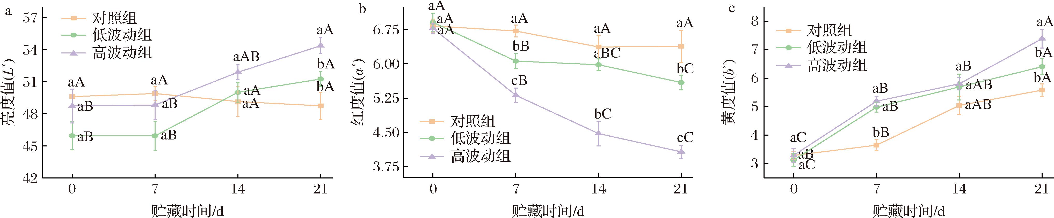 如图1所示,贮藏期间,对照组猪肉表面的亮度值(L*)无显著变化(P>0.05),而波动组L*值在贮藏后期均显著增加(P<0.05),这表明微冻贮藏中温度波动会影响猪肉的亮度值。此外,在贮藏第21天时,与对照组相比,低波动组的L*值无显著变化(P>0.05),而高波动组L*值显著增加(P<0.05),这可能是由于高温度波动条件下水分大量流失至猪肉表面,光的反射导致猪肉表面L*值增加[22]。类似地,对照组猪肉在贮藏过程中红度值(a*)保持稳定(P>0.05),而低波动组和高波动组猪肉的a*值均显著下降(P<0.05)。贮藏7 d和21 d,3组a*值差异显著,其中高波动组的a*值最低(P<0.05),这说明温度波动程度增加会导致a*值降低,肉色变暗。该结果和PIETRASIK等[23]、WANG等[24]的研究报道一致,温度波动会加速牛肉中肌红蛋白的氧化,使其从鲜红色的氧合肌红蛋白转变为棕色的高铁肌红蛋白。此外,猪肉黄度值(b*)在贮藏过程中升高,在贮藏7 d时,波动组b*值均显著高于对照组,延长至21 d时,高波动组的b*值显著高于对照组和低波动组(P<0.05),这可能是由于较高幅度的温度波动会使肌肉蛋白氧化程度增加,导致黄色色素积累[25]。以上结果表明,微冻贮藏过程中温度波动会导致肉色劣变,且波动幅度增加会加速肉色发生劣变。