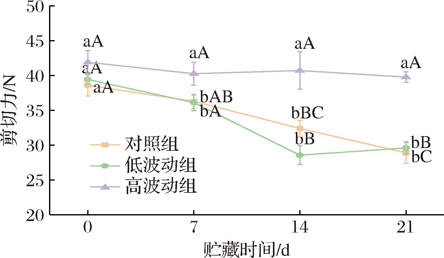 由图4可知,对照组和低波动组的剪切力值在微冻贮藏14 d时显著下降(P<0.05)。在微冻贮藏过程中,冰晶的形成会对肌肉组织细胞膜的强度造成破坏[31],导致肌肉剪切力降低,嫩度增加。高温度波动组的剪切力值显著高于另外两组(P<0.05),这表明较大的温度波动会使微冻处理的猪肉样品嫩度下降。研究表明,温度波动加剧可能导致肌纤维的无序降解,这会使肌纤维的断面变得不规则和粗糙[5],进而使剪切力增大、嫩度显著下降。另外,较大的温度波动会使猪肉经历反复冻融,导致其保水性显著下降[32],水分流失增加,肉质变得干硬,嫩度也随之降低。