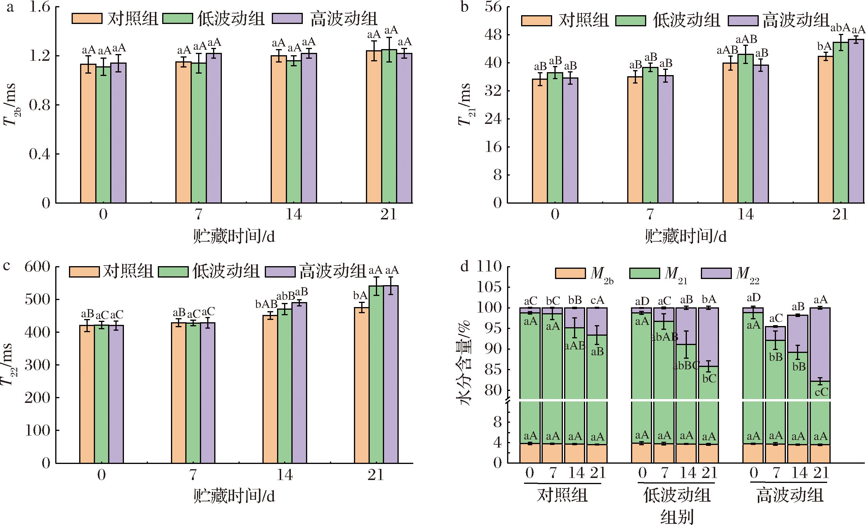 注:图5-d横坐标0、7、14、21为贮藏时间(d), M2b、M21、M22分别代表结合水、不易流动水和自由水的相对含量(%)。