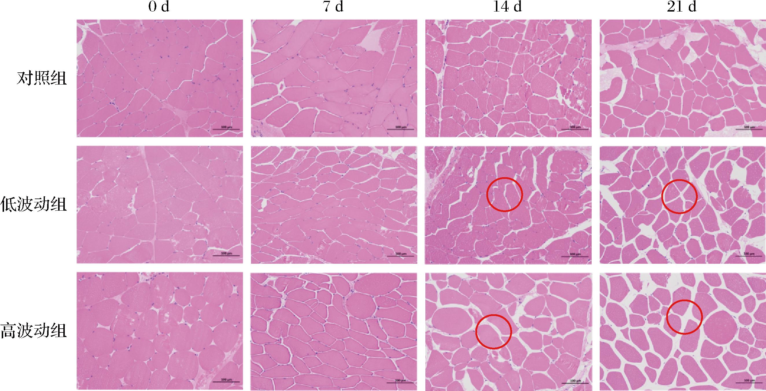 HE染色结果显示,微冻贮藏过程中温度波动对猪肉组织微观结构的影响主要表现在肌细胞间隙的变化,通常情况下,肌细胞排列致密,肌细胞间隙小,肌肉的保水性越好[33]。如图6所示,贮藏0 d时,肌细胞排列均匀而紧密,随着微冻贮藏时间延长,肌细胞间隙逐渐增大,其中对照组(未经温度波动)的肌细胞间隙最小,表明其肌肉组织学特性更为紧密,这也解释了对照组具有更优的保水性。相较于对照组而言,波动组的肌细胞间隙变化较大,这与李桢桢等[32]的研究结果一致。温度变化会引发冰晶的重结晶现象,冰晶在反复冻结过程中通过小冰晶的聚集、位移及表面渗透等方式生长,导致其体积增大、形状不规则化。这种变化会对肌肉组织产生挤压作用,进而影响持水性、质构等品质特性下降[32]。与(-3±2) ℃组相比,(-3±4) ℃组样品中肌细胞间隙变化更为明显,特别是贮藏14 d和21 d时,肌肉细胞外空间明显变大(红色圆圈所示)。研究表明,肌细胞间隙与汁液流失率呈正相关[34],细胞间隙增加会加剧猪肉样品的汁液流失,导致保水性下降,这也解释了高波动组猪肉样品更低的保水性。综上,微冻贮藏中温度波动能够通过影响猪肉组织结构的紧密状态,进而影响猪肉的保水性。
