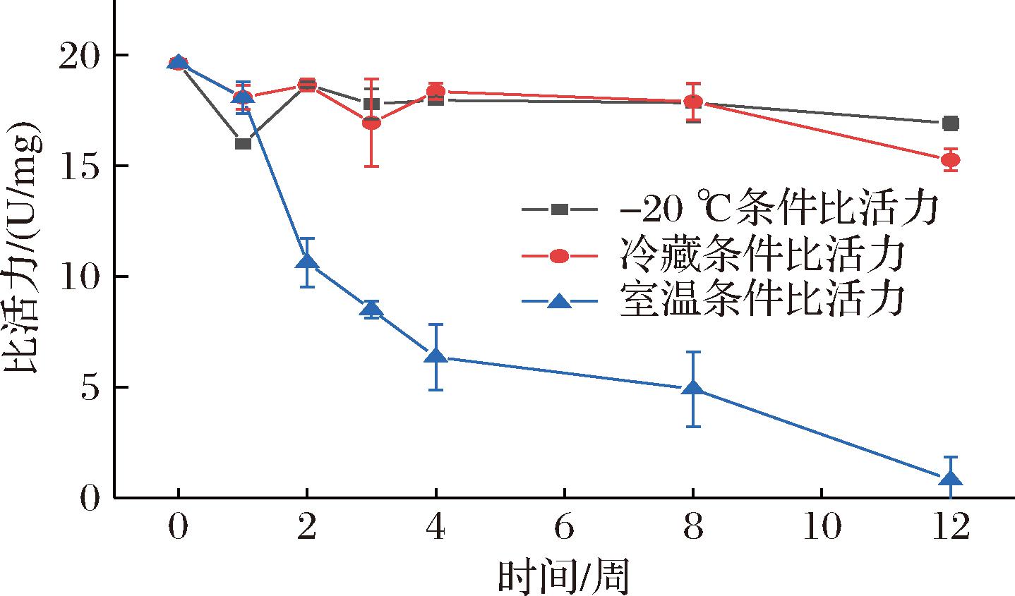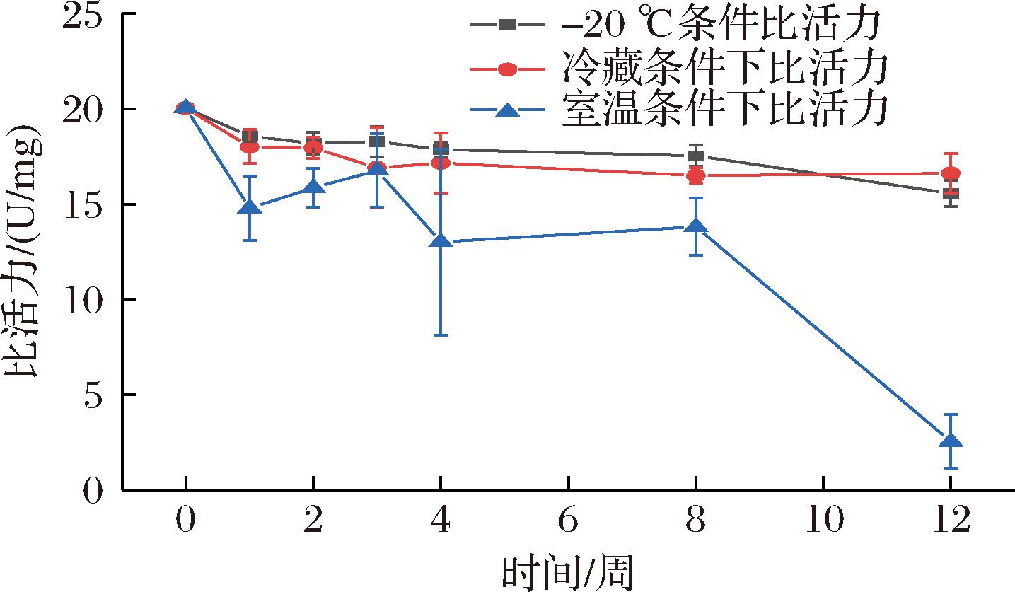 将纯化洗脱峰1分装至0.2 mL离心管,进行冷冻干燥获得冻干粉,将冻干粉分别于-20 ℃、冷藏(2~8 ℃)、室温(20~25 ℃)下保存定期测定其比活力。结果显示与10%甘油保护的Kex2类似,冻干粉在-20 ℃及冷藏条件下均较为稳定,冻干样起始比活力为19.63 U/mg,-20 ℃及冷藏条件下3个月后分别为16.93、15.27 U/mg,而室温条件下酶活力下降明显,在保存3个月后其比活力由原来的19.64 U/mg下降至0.81 U/mg(图9)。室温下溶液状态的Kex2(含10%甘油)比活力较冻干粉下降的慢,可能是甘油对酶具有一定的保护效果。