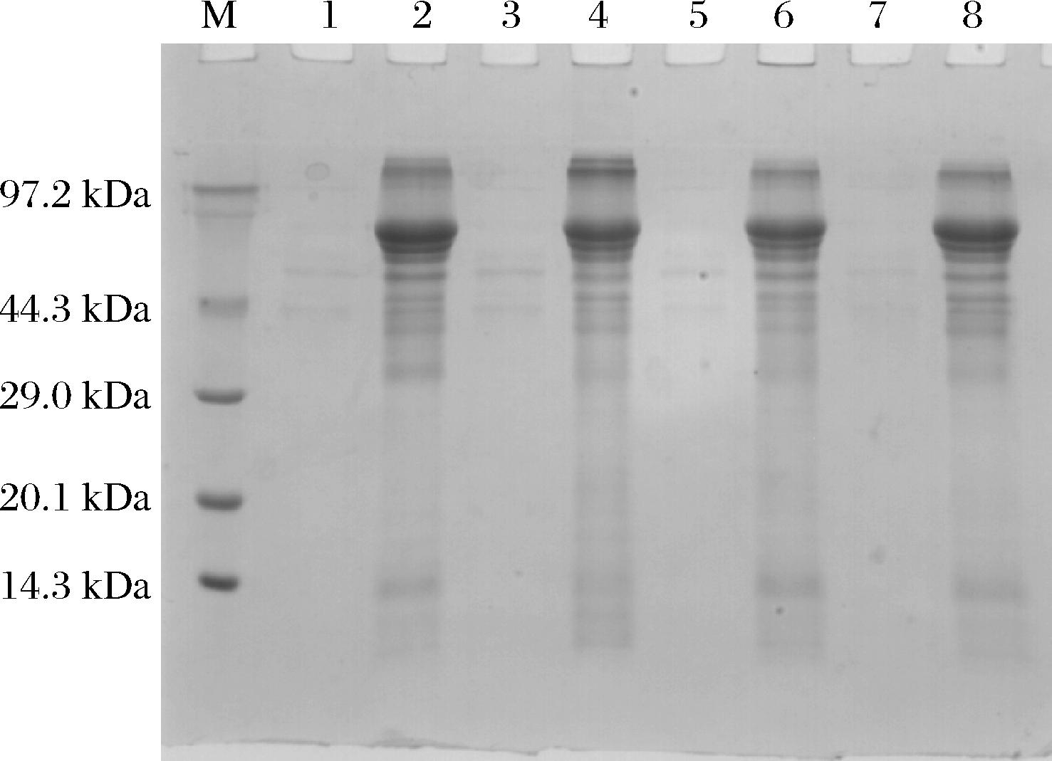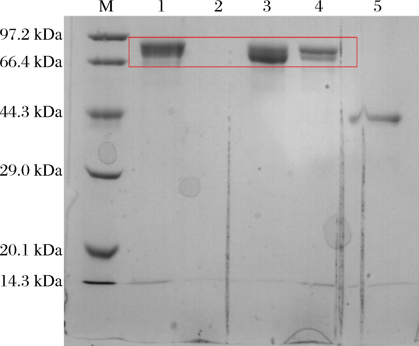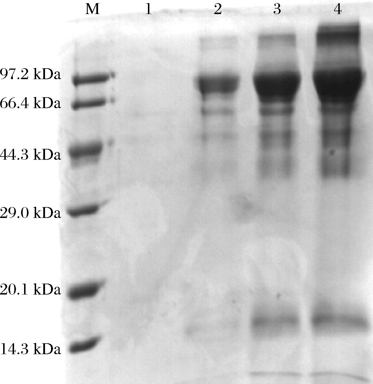 使用5 L四联罐对随机筛选的4个转化株进行了发酵表达,首先以甘油为碳源进行菌体细胞增殖,随后利用甲醇进行Kex2的基因诱导表达,取发酵上清液进行电泳检测,结果显示4个转化株在44.3~97.2 kDa之间有明显表达条带(图3),重组Kex2的理论分子质量为70 kDa,而诱导前发酵上清液中无此条带,说明Kex2分泌表达成功。