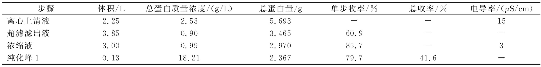 发酵上清液中含有较高的离子强度,经测定其电导率为15 μS/cm,无法直接进行离子交换柱上样,需对其进行预处理。首先使用750 kDa中空纤维柱对2.25 L发酵离心上清液进行过滤,在循环液体积低于起始体积1/3时加入和起始离心上清液等体积的10 mmol/L HAc-NaAc (pH 5.0)缓冲液对循环液进行洗涤,超滤循环至最小体积时,收集滤出液共3.85 L,测定总蛋白浓度计算超滤总蛋白收率,滤出液使用5 kDa中空纤维柱进行浓缩以除去发酵液中的离子,当浓缩至最小体积时加入适量10 mmol/L HAc-NaAc(pH 5.0)缓冲液对浓缩液进行换液,最终获得浓缩换液样3.0 L,测定其总蛋白浓度计算浓缩总蛋白收率(表1)。经测定浓缩换液样电导率为3.0 μS/cm。
