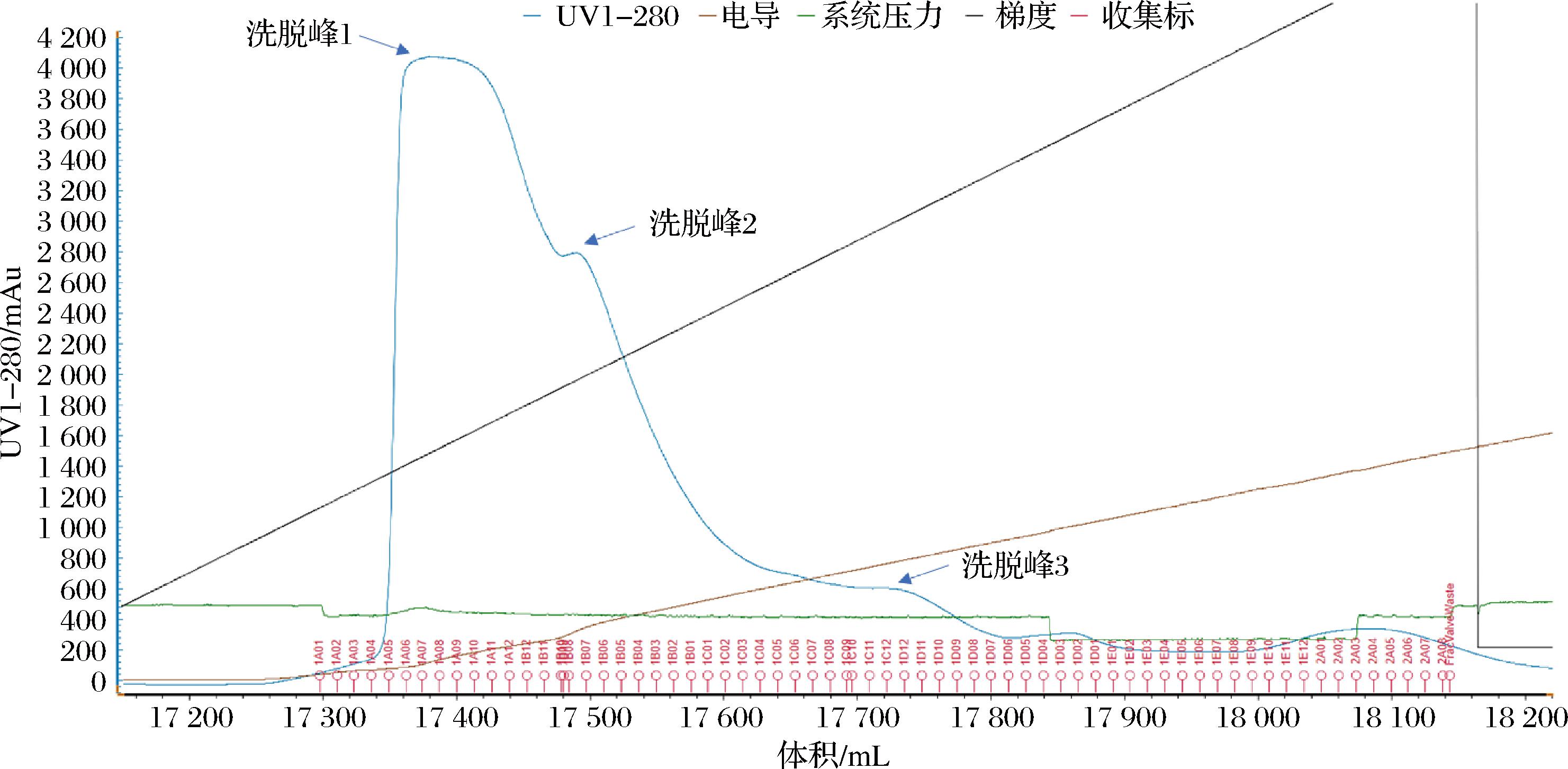 使用BSM培养基发酵完成后离心上清液中仍含有较多的固体颗粒且具有较高的离子强度,直接上样可能造成样品流穿或对纯化柱带来损坏。本研究通过不同孔径的超滤柱配合使用,成功实现了发酵液上柱前预处理,完全达到纯化柱上样要求(溶液澄清、电导率<5.0 μS/cm),两步处理总蛋白收率为52.2%。该方法避免了简单的稀释上样带来的上样体积过大及部分流穿损失等问题。在不进行超滤换液的情况下,仅通过稀释将发酵上清液电导率由>15 μS/cm降低至5.0 μS/cm约需4~6倍体积(数据未列出)的稀释缓冲液,规模化生产时将产生大量的废液,部分研究者采用了透析的方式对发酵上清液进行预处理,但该方法难以规模化生产。