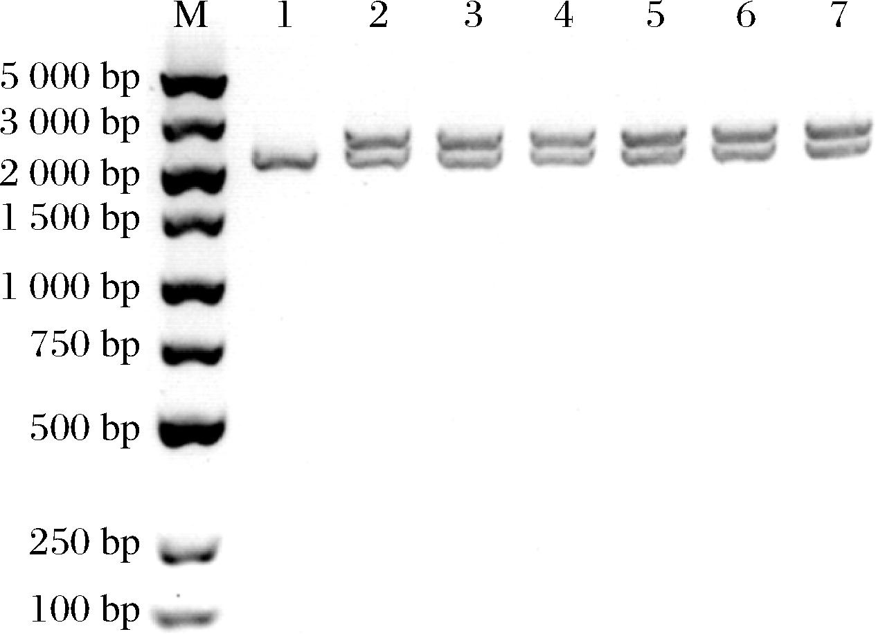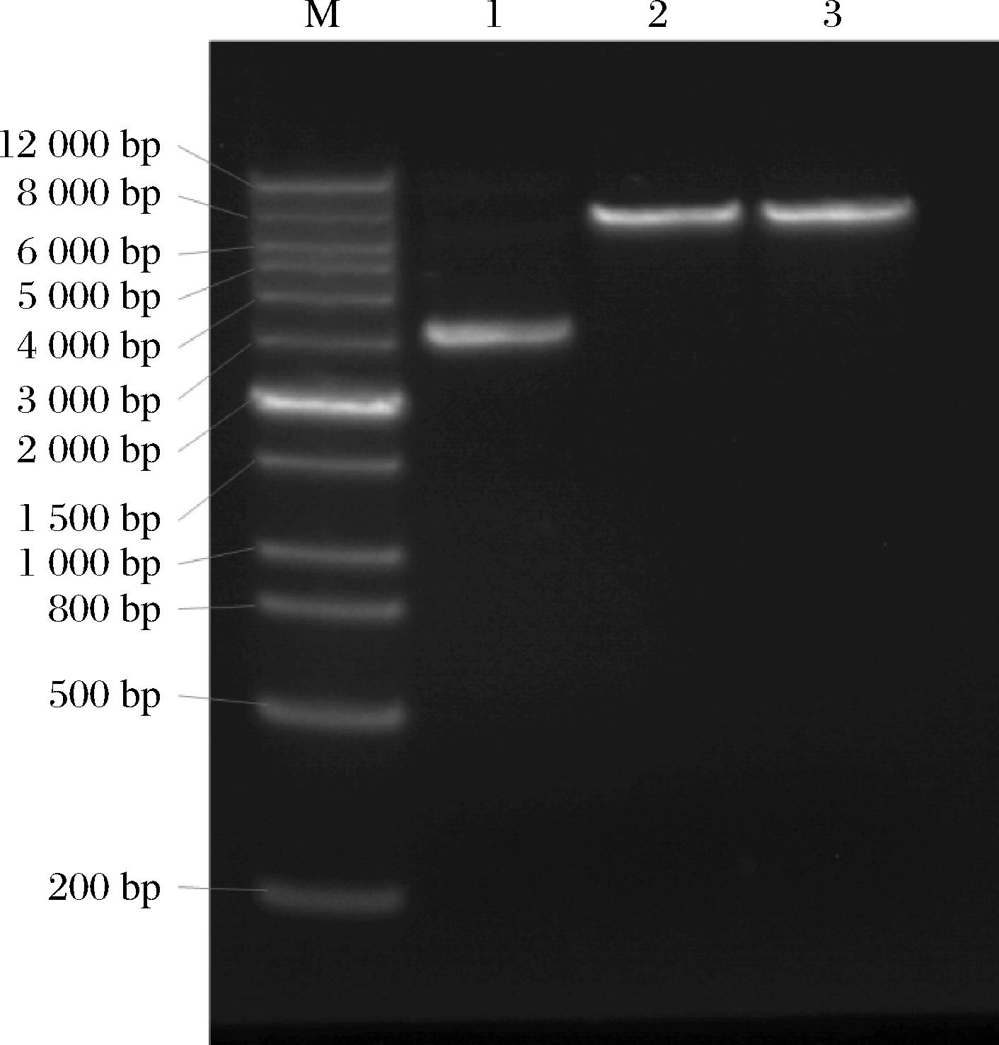 使用限制性内切酶Sac I对表达质粒进行了线性化,酶切结束使用80 ℃温育20 min使酶失活,取2 μL进行电泳检测,结果显示酶切后条带单一且其迁移速率明显低于酶切前样,说明质粒被完全切开(图1),使用酚氯仿纯化1次,75%(体积分数)乙醇沉淀、12 000 r/min离心5 min,沉淀使用无酶无菌水溶解备用。