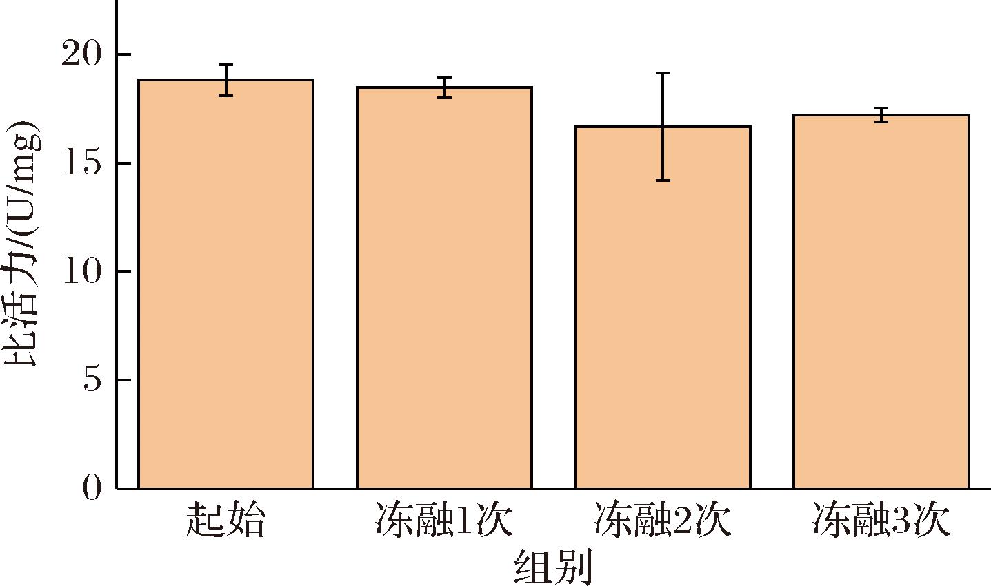 加10%甘油的纯化酶放入-20 ℃冰箱2 h取出于室温解冻测定其比活力,共进行3次连续冻融,分别测定样品每次冻融后的剩余比活力,每次测定做3次重复(图8),结果显示比活力由起始的18.81 U/mg降至17.2 U/mg,方差分析显示冻融3次后酶比活力无显著性下降(P=0.22>0.05)。