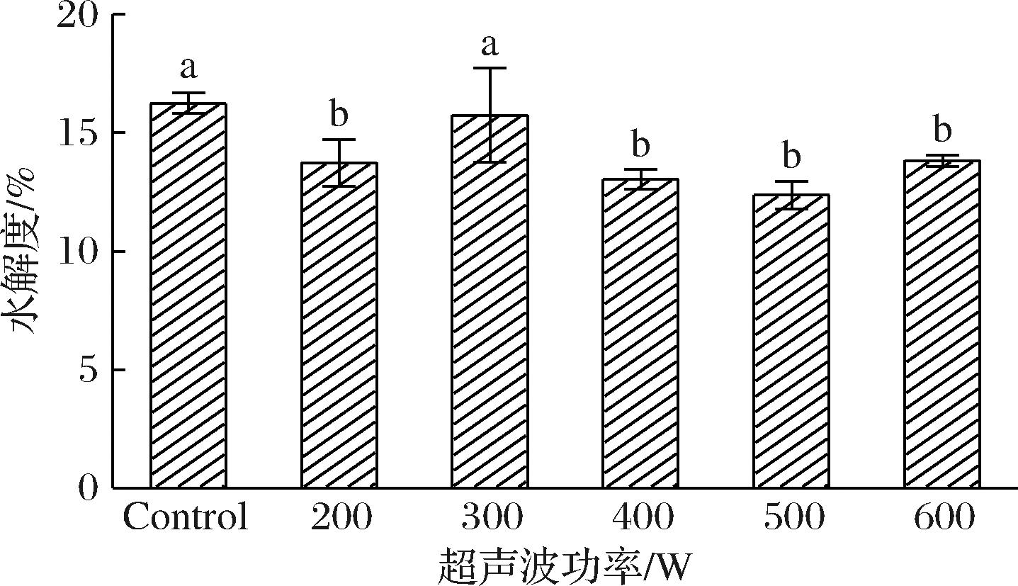如图4所示,小麦麸质的消化率在不同超声波功率下表现出显著差异。与对照组(16.2%)相比,200 W超声波处理后水解度降至13.7%,减少约15%。在300 W下,水解度回升至15.7%,与对照组无显著差异。然而,当超声波功率增加至500 W时,水解度降至所有处理组中的最低值,仅为12.4%,减少约23%。在600 W时,水解度略微回升至13.8%,但仍显著低于对照组的水平。
