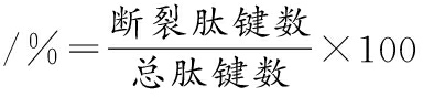 基于KUANG等[18]的方法,并略作修改。将含有50 mg蛋白质的麸质样品溶解在5 mL人工胃液中(胃蛋白酶活性为182 U/mg),并轻轻搅拌。样品在37 ℃下消化1 h。消化完成后,加入100 μL的1 mol/L NaOH以停止反应。随后,加入5 mL胰酶溶液(40 U/mg胰蛋白酶和0.5 U/mg胰凝乳蛋白酶)。使用1 mol/L NaOH溶液调节混合物的pH至7.8,样品在37 ℃下继续消化1 h。