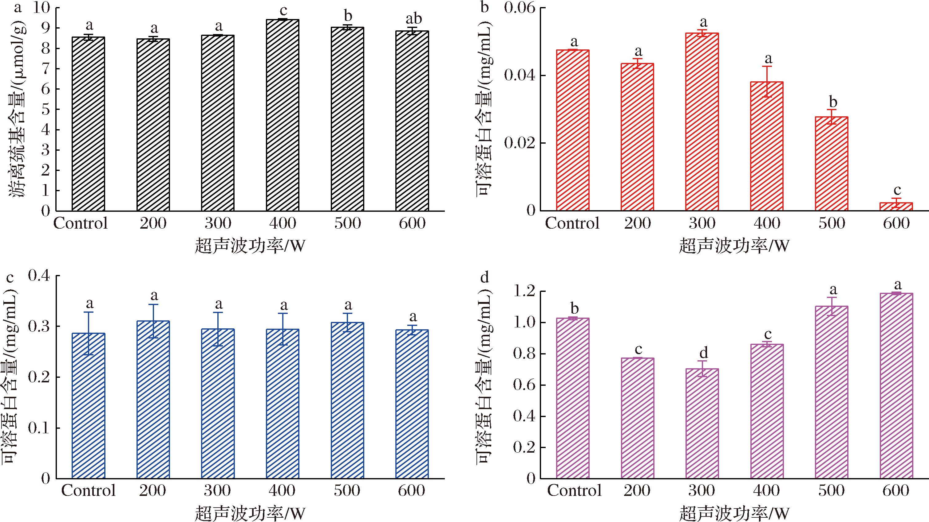 如图2-a所示,对照组与200、300 W超声波处理组之间游离巯基含量没有显著差异。然而,当超声波功率增至400 W时,样品的游离巯基含量比对照组增加了约11%,并达到了所有组别中的最高值。随着超声波功率的进一步增加,巯基含量略有下降,但仍显著高于对照组。这与JIANG等[22]的研究结果一致,超声波的空化效应导致蛋白质的变性、解聚和展开,暴露出更多原本隐藏于蛋白质结构中的巯基。然而,在较高功率的超声波处理下(500、600 W),巯基含量出现了轻微的下降,这可能是由于过量的羟自由基生成,进一步氧化了巯基。