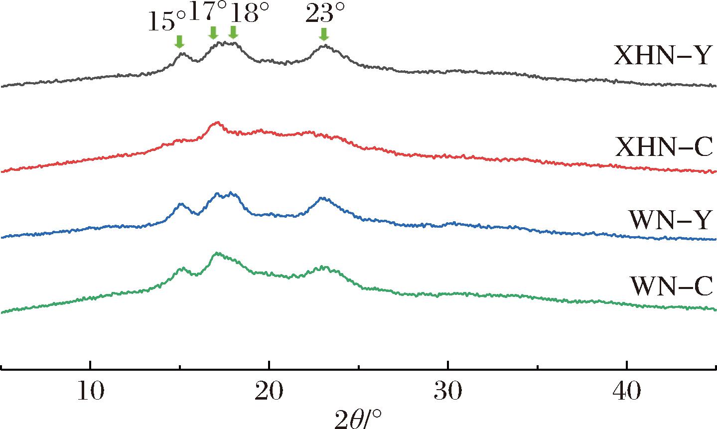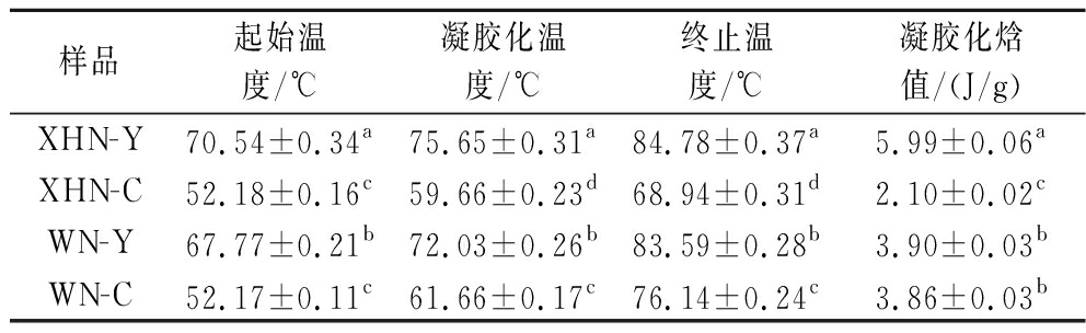 样品起始温度/℃凝胶化温度/℃终止温度/℃凝胶化焓值/(J/g)XHN-Y70.54±0.34a75.65±0.31a84.78±0.37a5.99±0.06aXHN-C52.18±0.16c59.66±0.23d68.94±0.31d2.10±0.02cWN-Y67.77±0.21b72.03±0.26b83.59±0.28b3.90±0.03bWN-C52.17±0.11c61.66±0.17c76.14±0.24c3.86±0.03b