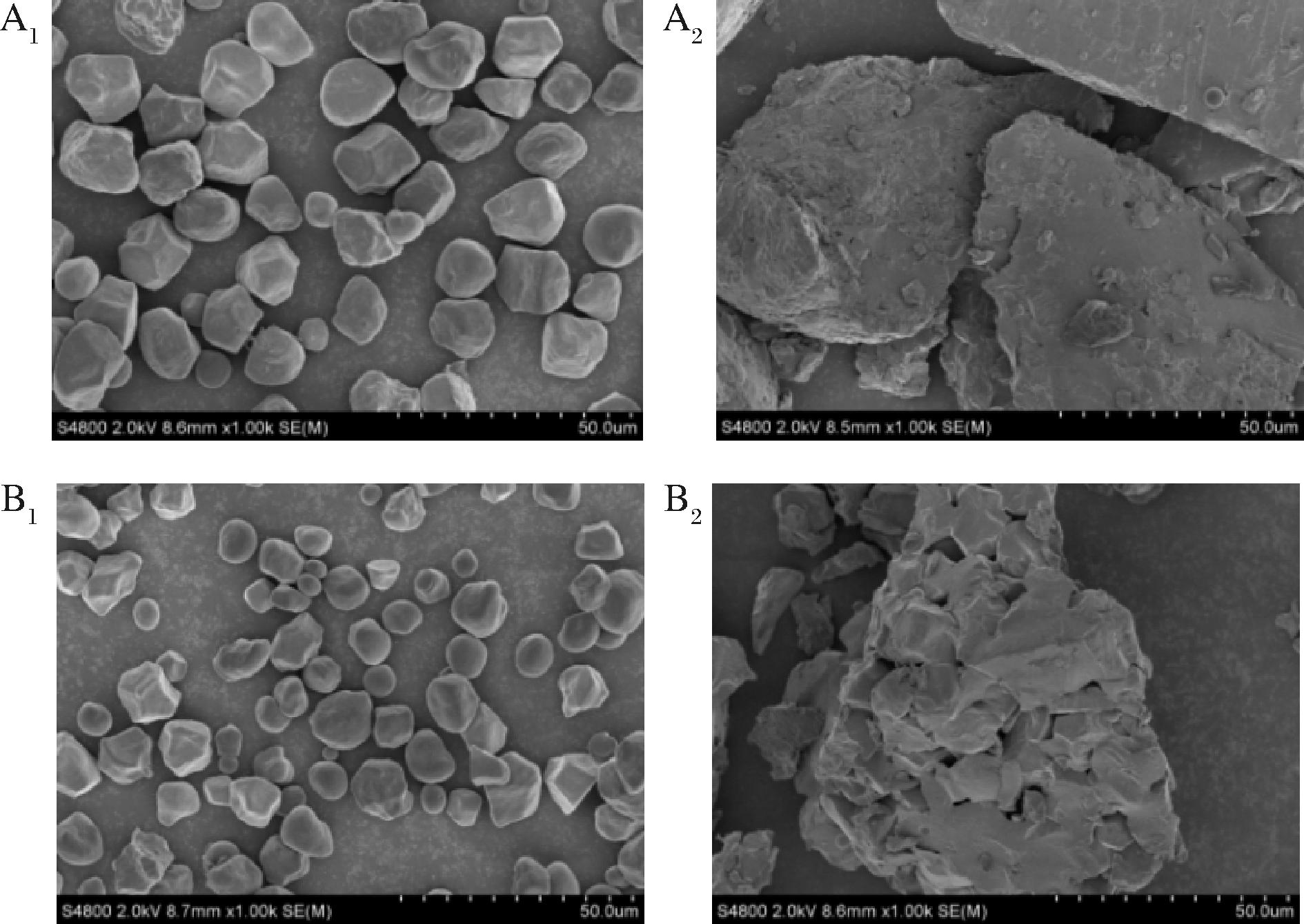 如图1-A1和图1-B1所示,未处理的2种鲜食糯玉米淀粉颗粒分布较分散,呈现完整的颗粒状,少部分颗粒呈褶皱形态。如图1-A2和图1-B2所示,2种鲜食糯玉米经速冻加工后,淀粉颗粒结构成不规则块状,表面出现孔隙结构,呈团块状聚集分布,这可能是由于鲜食糯玉米在速冻加工过程中,受到快速冻结的影响,导致玉米内部的水分形成冰晶,产生较大的机械力,破坏了淀粉结构,呈现出无定型淀粉基的交联状态,致使糯玉米淀粉颗粒表面出现孔隙结构且形状不规则,最终改变了鲜食糯玉米淀粉颗粒结构[7]。