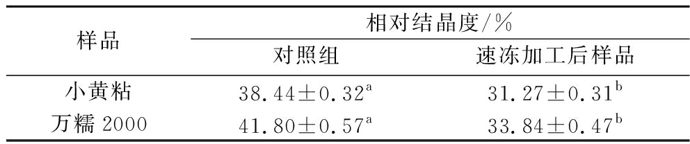 样品相对结晶度/%对照组速冻加工后样品小黄粘38.44±0.32a31.27±0.31b万糯200041.80±0.57a33.84±0.47b