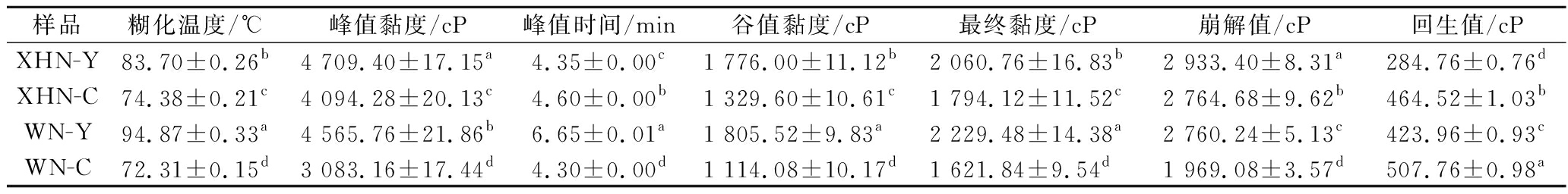 样品糊化温度/℃峰值黏度/cP峰值时间/min谷值黏度/cP最终黏度/cP崩解值/cP回生值/cPXHN-Y83.70±0.26b4 709.40±17.15a4.35±0.00c1 776.00±11.12b2 060.76±16.83b2 933.40±8.31a284.76±0.76dXHN-C74.38±0.21c4 094.28±20.13c4.60±0.00b1 329.60±10.61c1 794.12±11.52c2 764.68±9.62b464.52±1.03bWN-Y94.87±0.33a4 565.76±21.86b6.65±0.01a1 805.52±9.83a2 229.48±14.38a2 760.24±5.13c423.96±0.93cWN-C72.31±0.15d3 083.16±17.44d4.30±0.00d1 114.08±10.17d1 621.84±9.54d1 969.08±3.57d507.76±0.98a